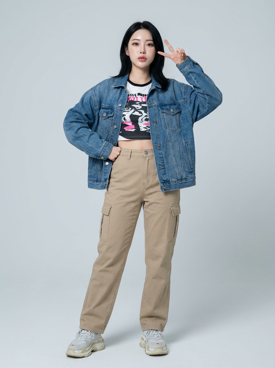 Korean model (with black hair) (as korean kpop k-pop idol) posing for photo, wearing Korean clothes, Korean fashion, Korean fashion, Korean makeup, (in front of solid background)