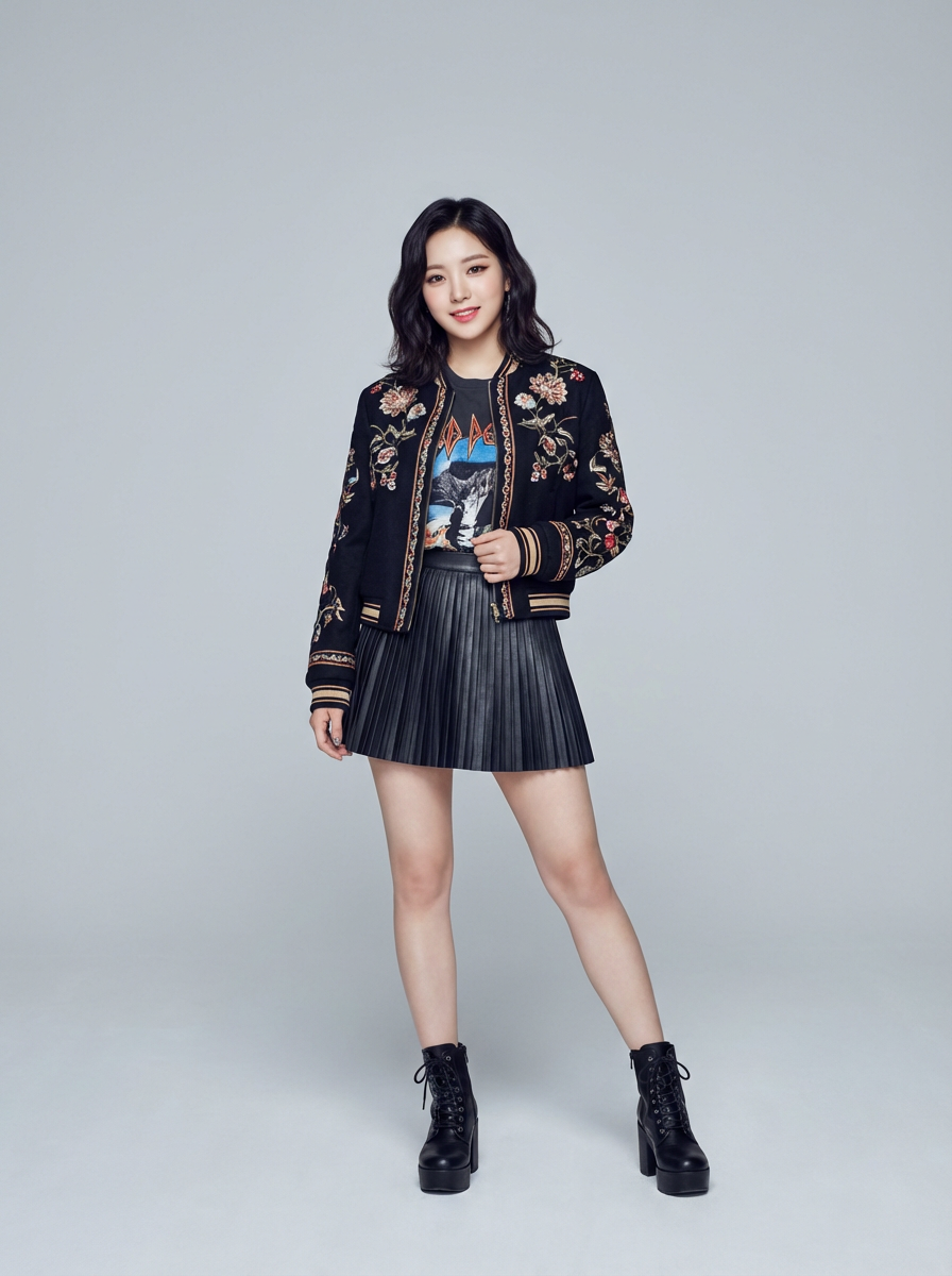 Korean model (with black hair) (as korean kpop k-pop idol) posing for photo, wearing Korean clothes, Korean fashion, Korean fashion, Korean makeup, (in front of solid background)