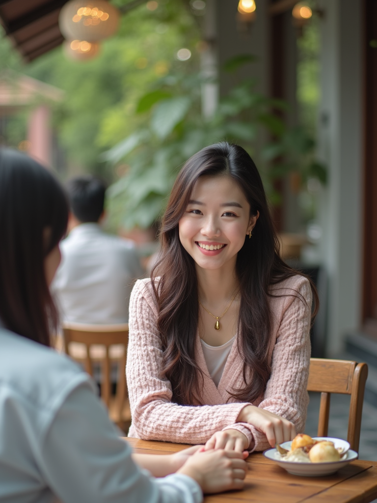 laid-back feminine model chatting with a friend at a casual outdoor table