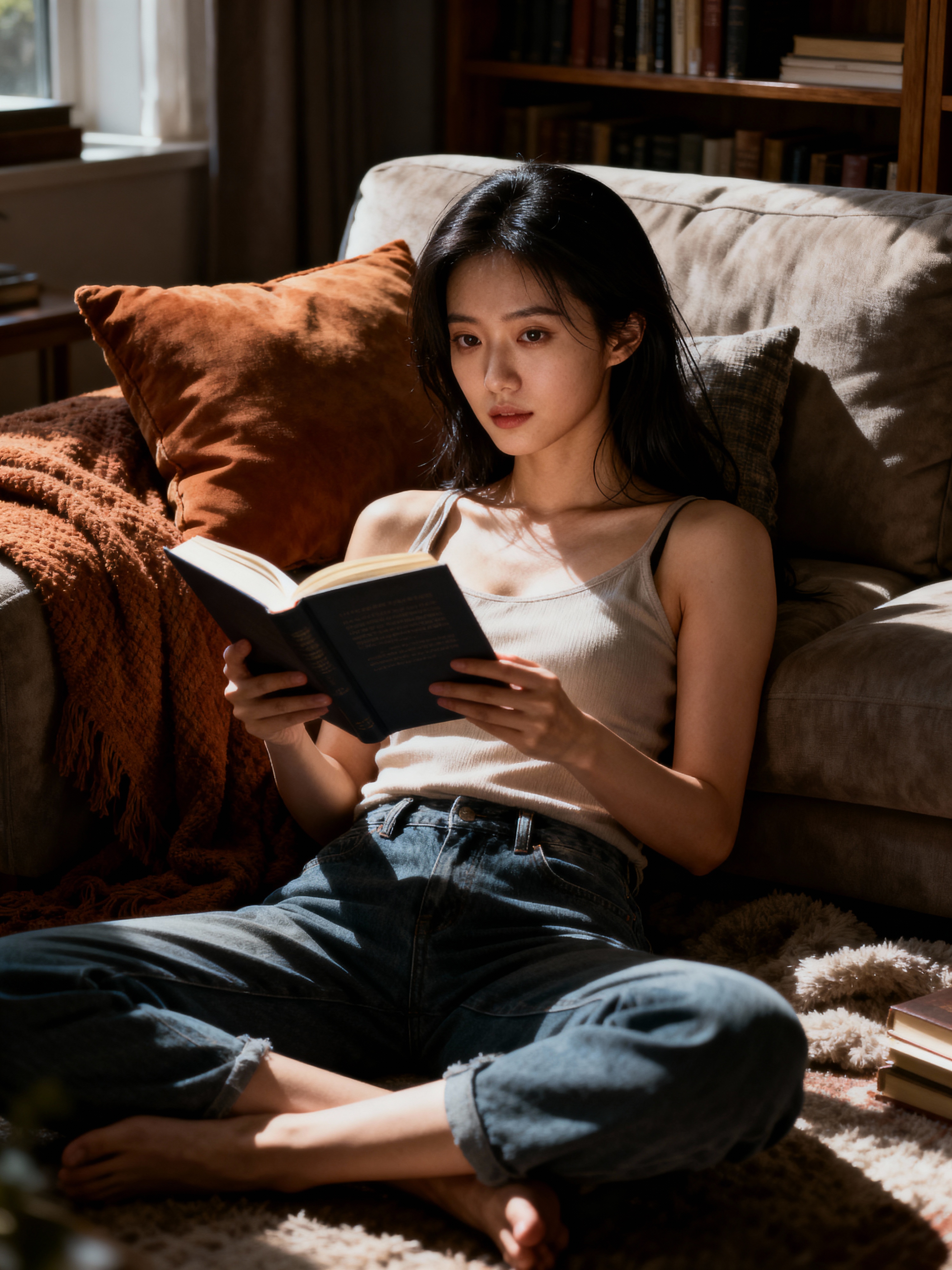 laid-back feminine model reading a book in a cozy living room