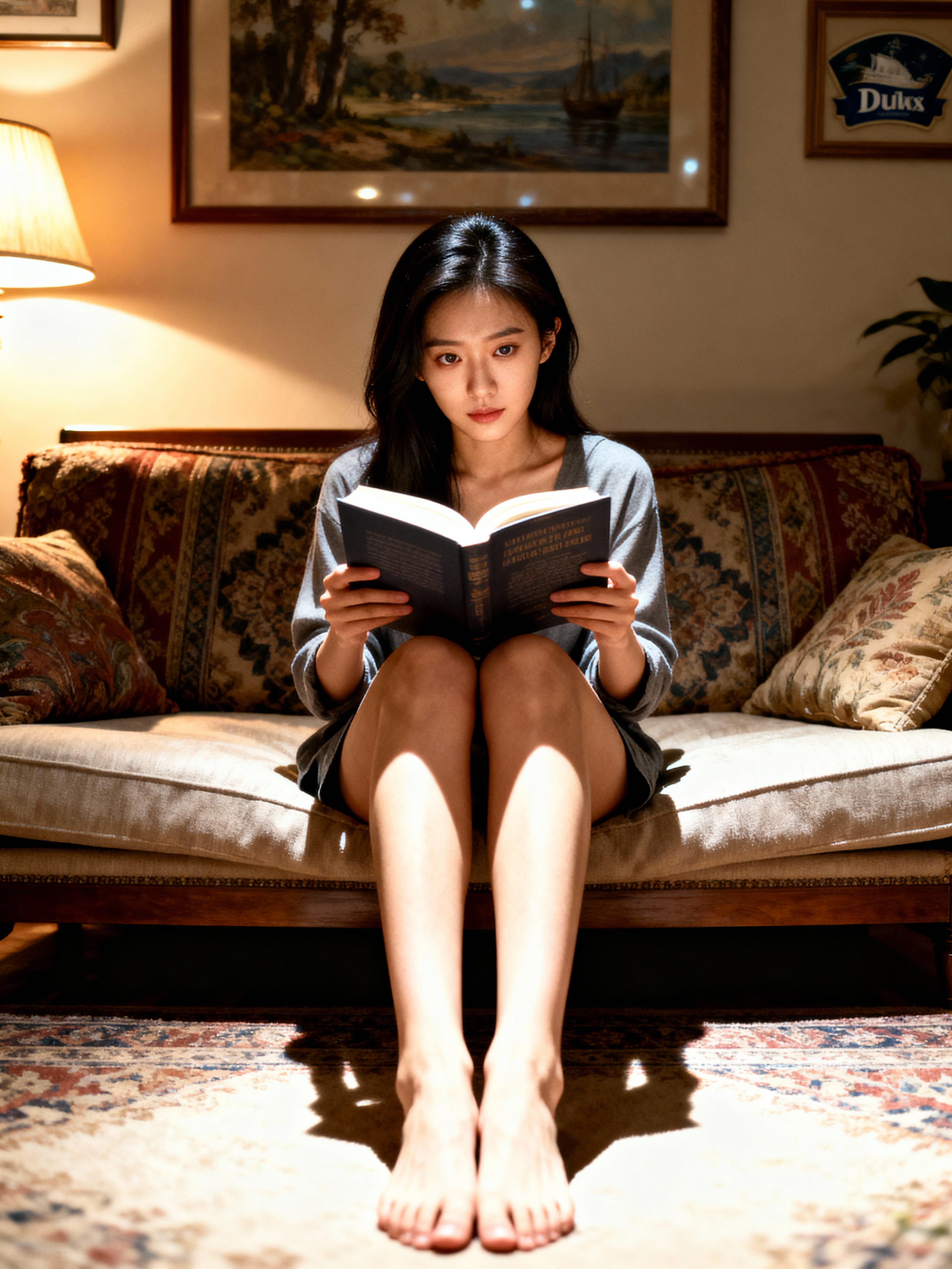 laid-back feminine model reading a book in a cozy living room