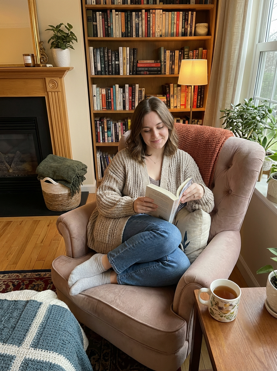 laid-back feminine model reading a book in a cozy living room