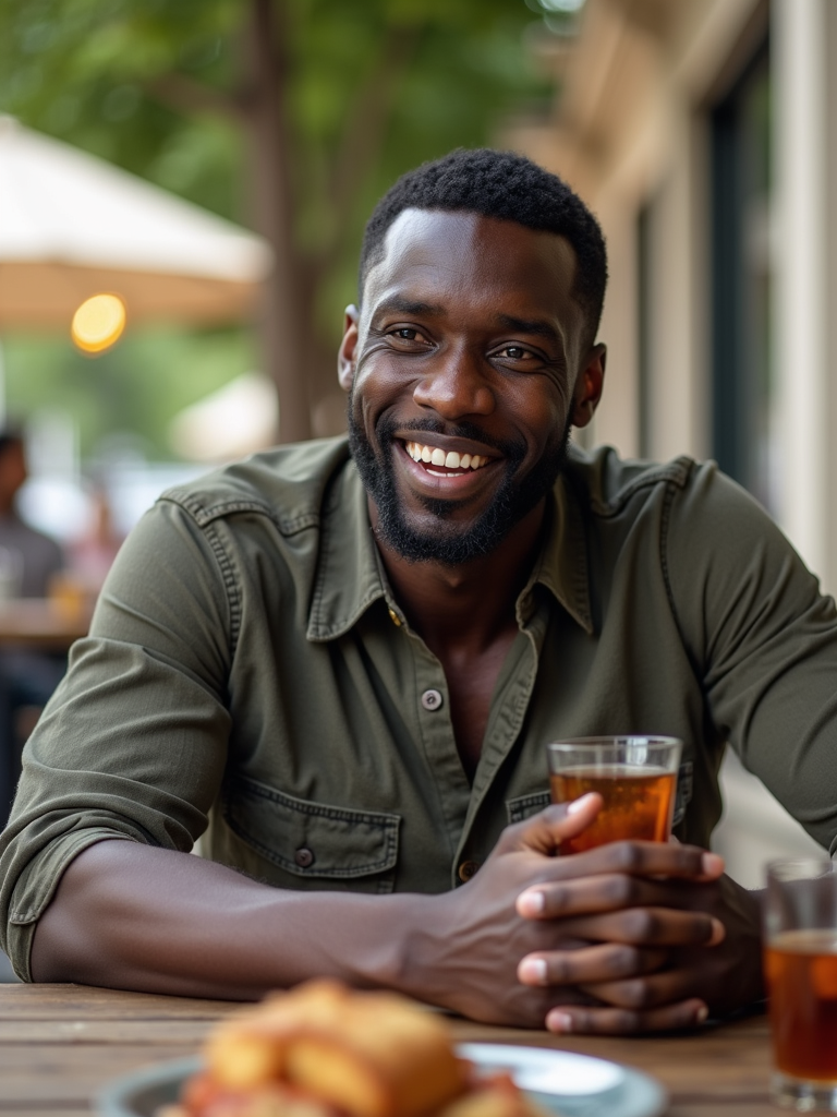 laid-back masculine model chatting with a friend at a casual outdoor table