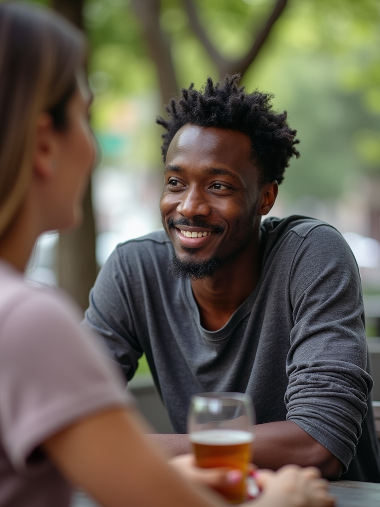 laid-back masculine model chatting with a friend at a casual outdoor table