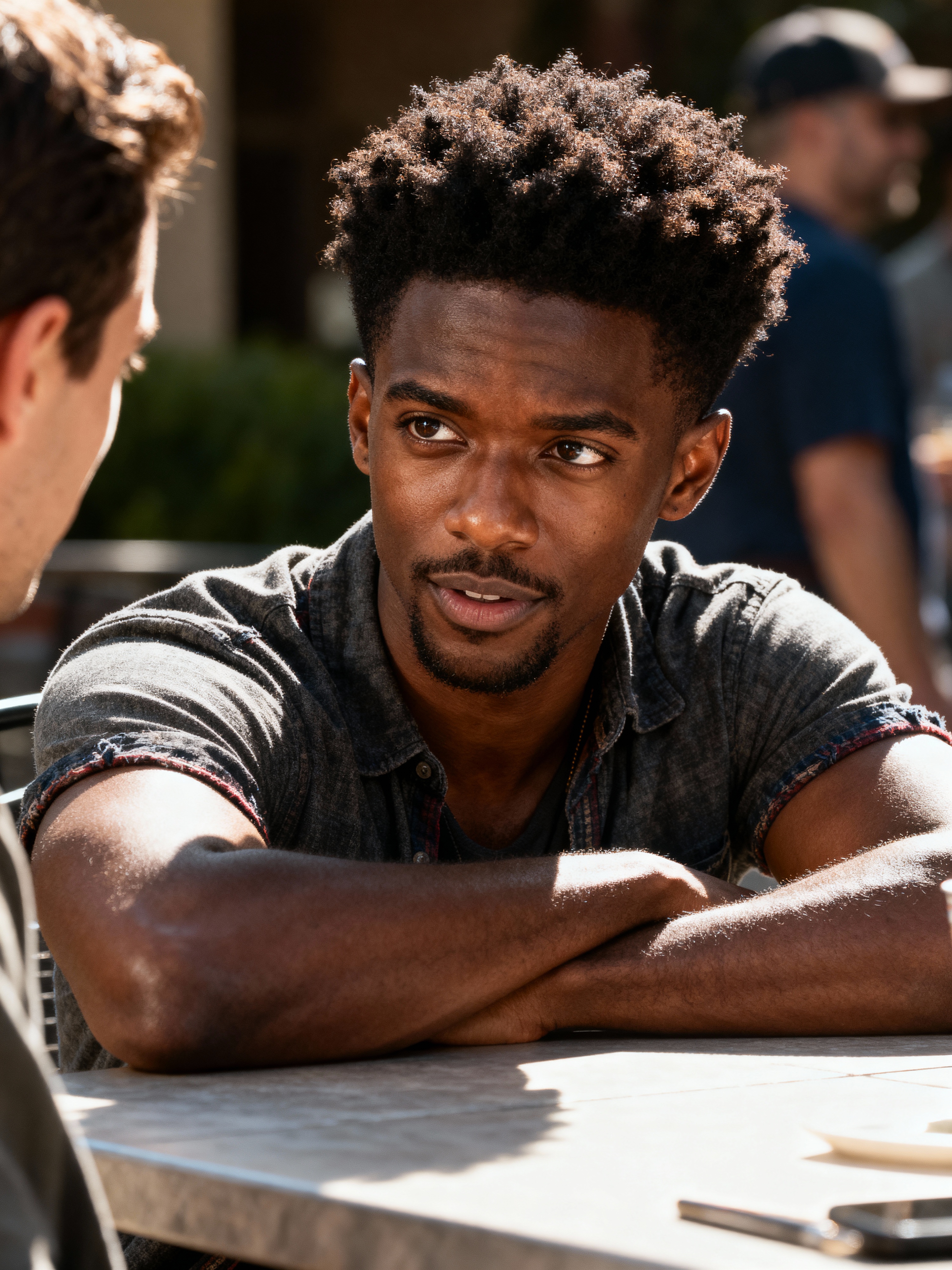 laid-back masculine model chatting with a friend at a casual outdoor table