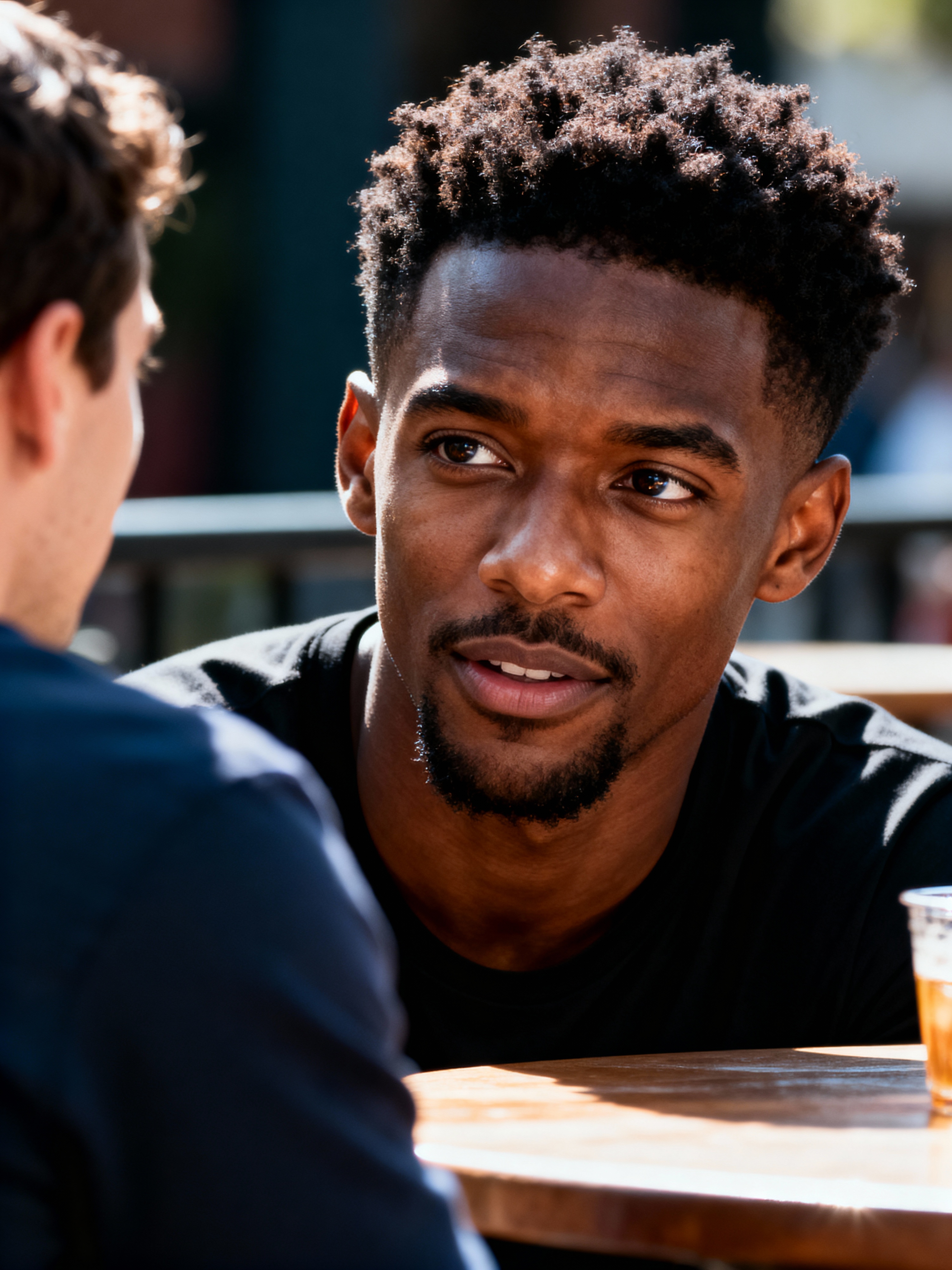 laid-back masculine model chatting with a friend at a casual outdoor table