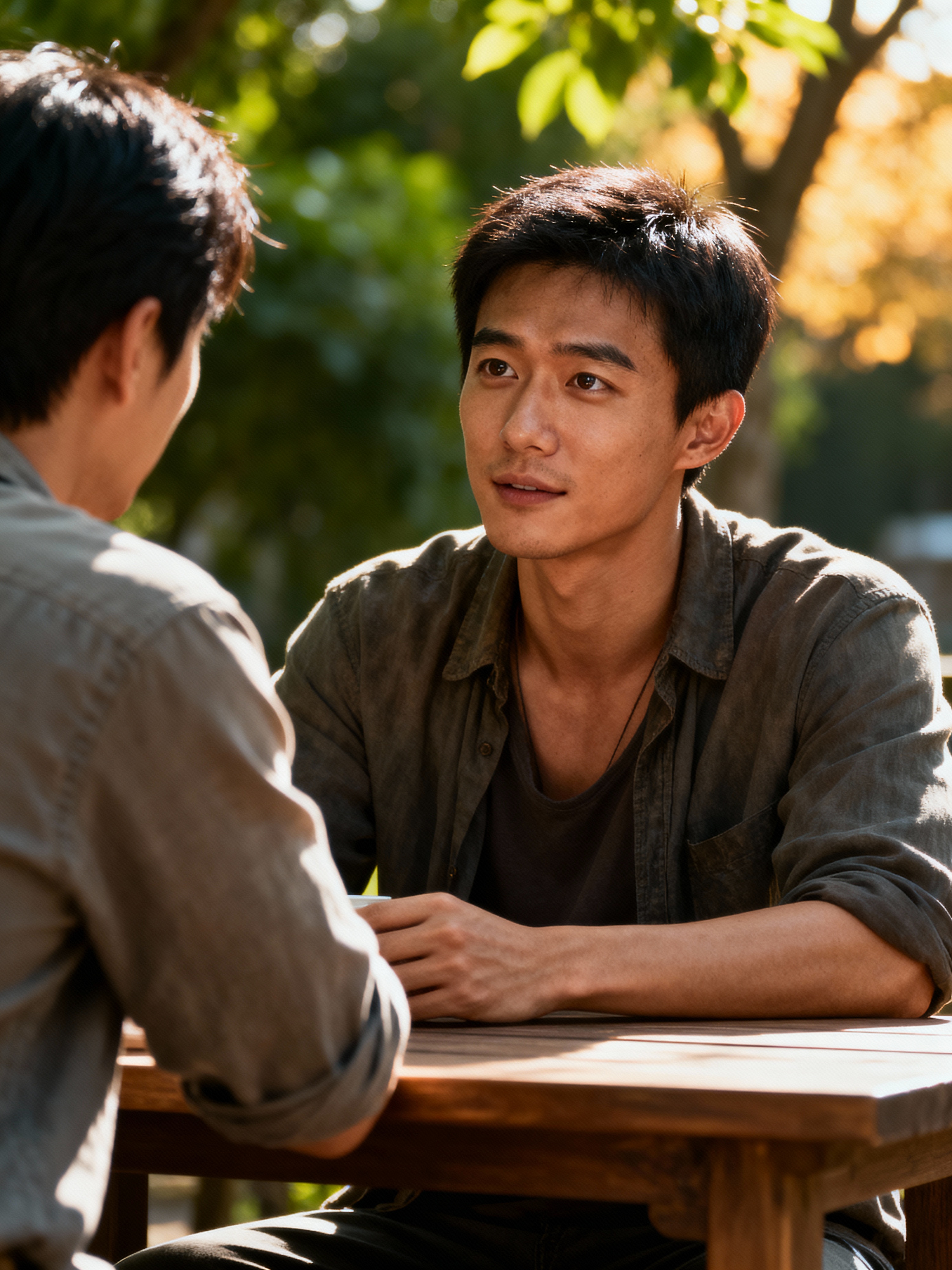 laid-back masculine model chatting with a friend at a casual outdoor table
