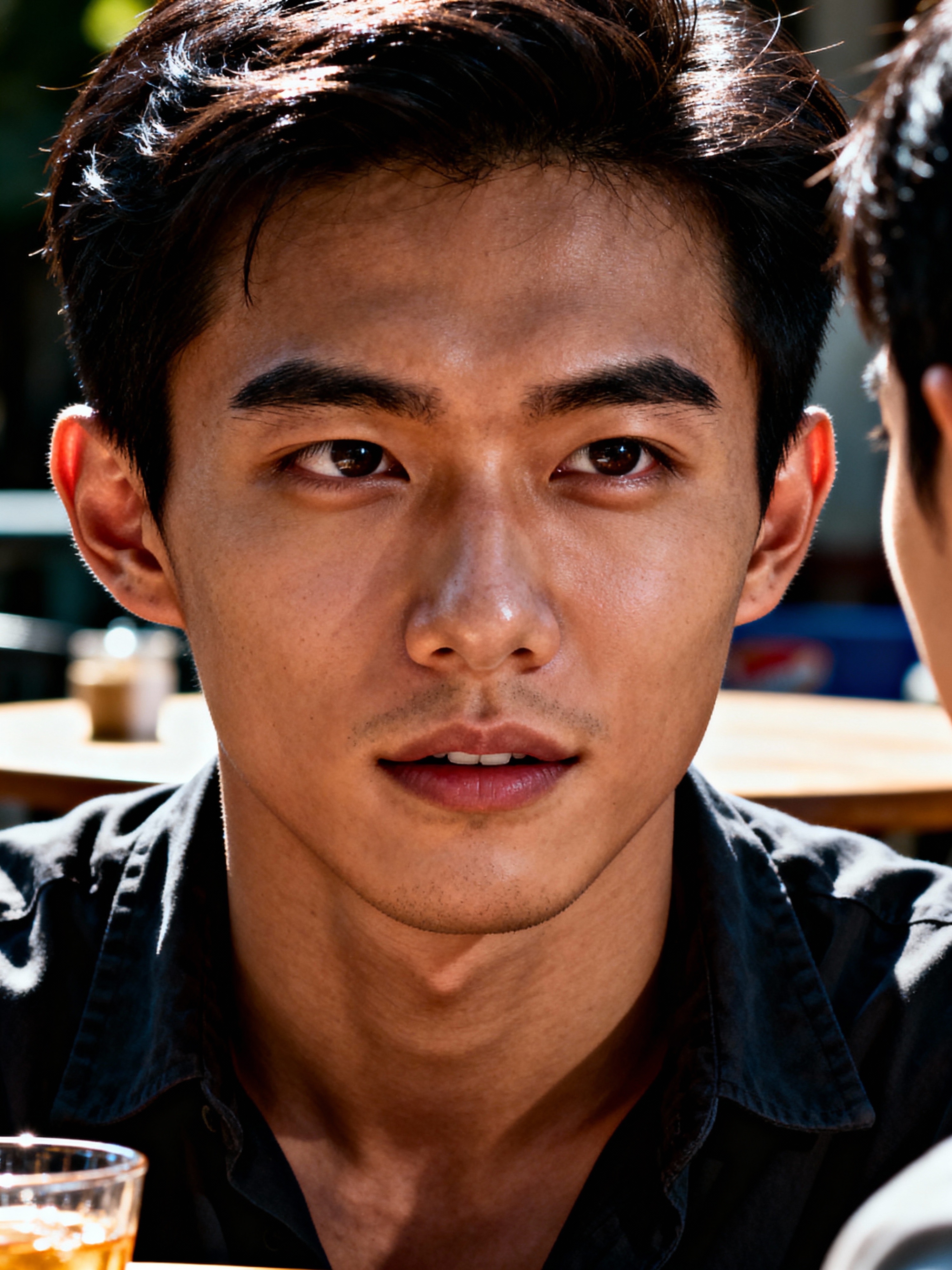 laid-back masculine model chatting with a friend at a casual outdoor table