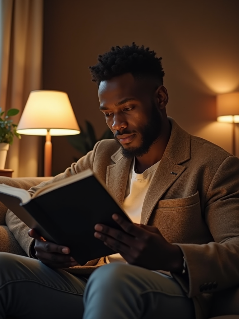 laid-back masculine model reading a book in a cozy living room