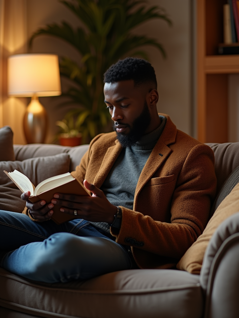 laid-back masculine model reading a book in a cozy living room