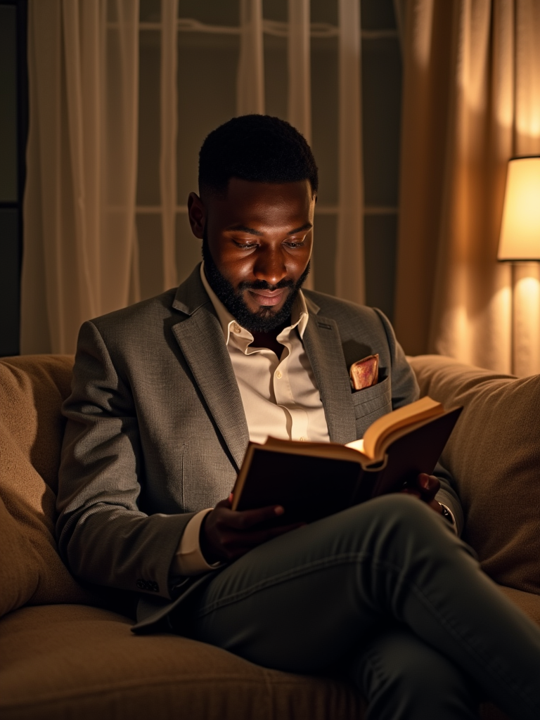 laid-back masculine model reading a book in a cozy living room