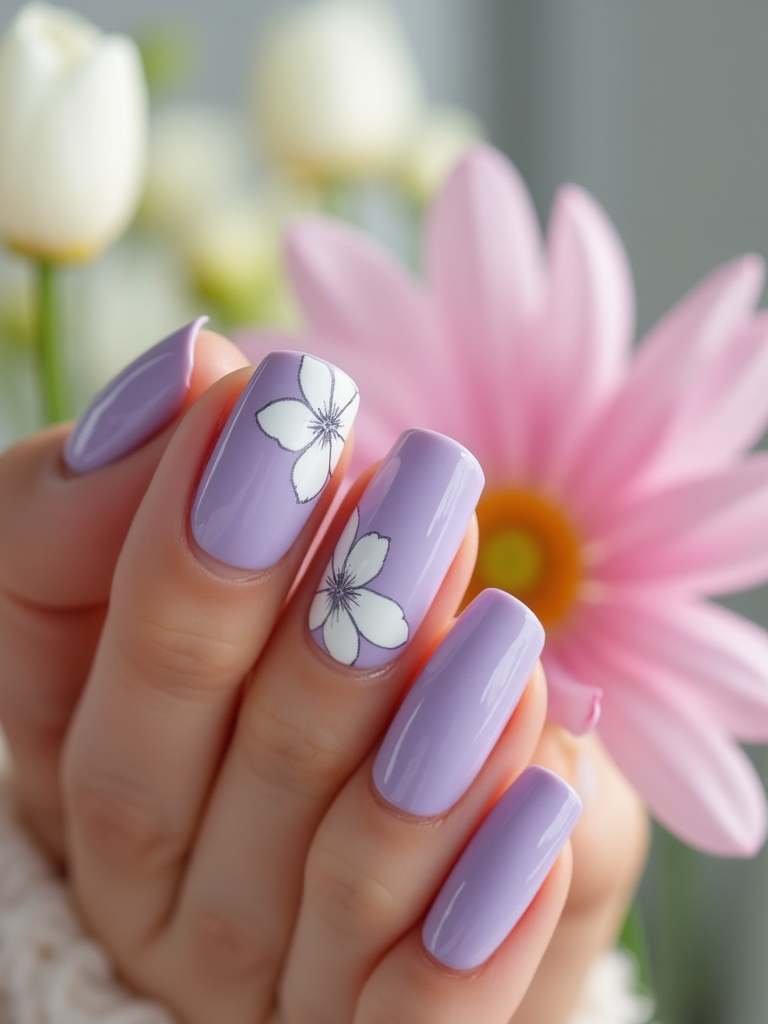lavender nails with white floral nail art, spring-themed background, soft natural light, close-up of fingers holding a flower, Instagram-ready shot