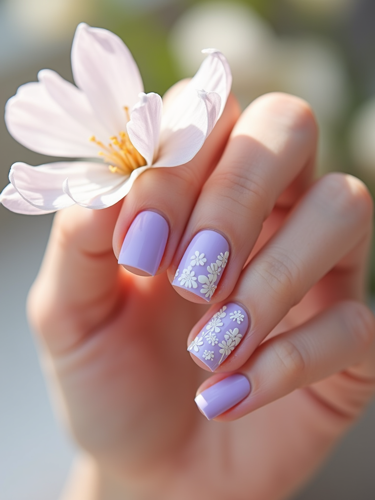 lavender nails with white floral nail art, spring-themed background, soft natural light, close-up of fingers holding a flower, Instagram-ready shot