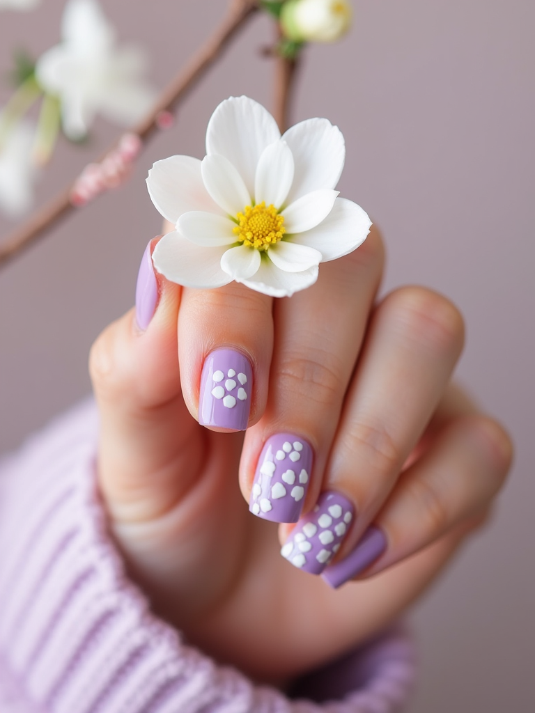 lavender nails with white floral nail art, spring-themed background, soft natural light, close-up of fingers holding a flower, Instagram-ready shot