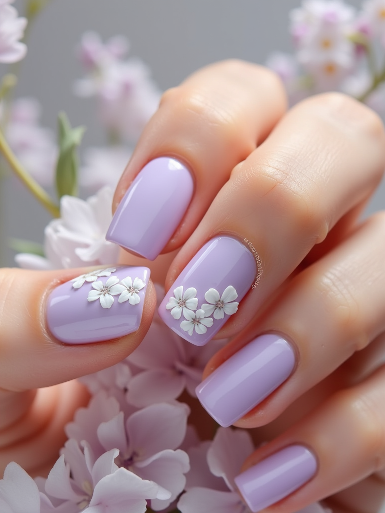 lavender nails with white floral nail art, spring-themed background, soft natural light, close-up of fingers holding a flower, Instagram-ready shot