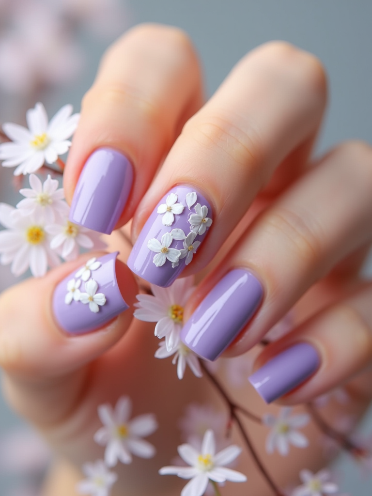 lavender nails with white floral nail art, spring-themed background, soft natural light, close-up of fingers holding a flower, Instagram-ready shot