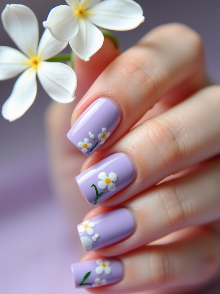 lavender nails with white floral nail art, spring-themed background, soft natural light, close-up of fingers holding a flower, Instagram-ready shot