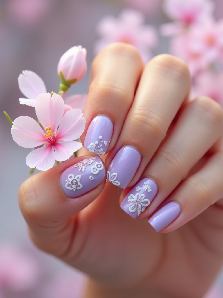 lavender nails with white floral nail art, spring-themed background, soft natural light, close-up of fingers holding a flower, Instagram-ready shot