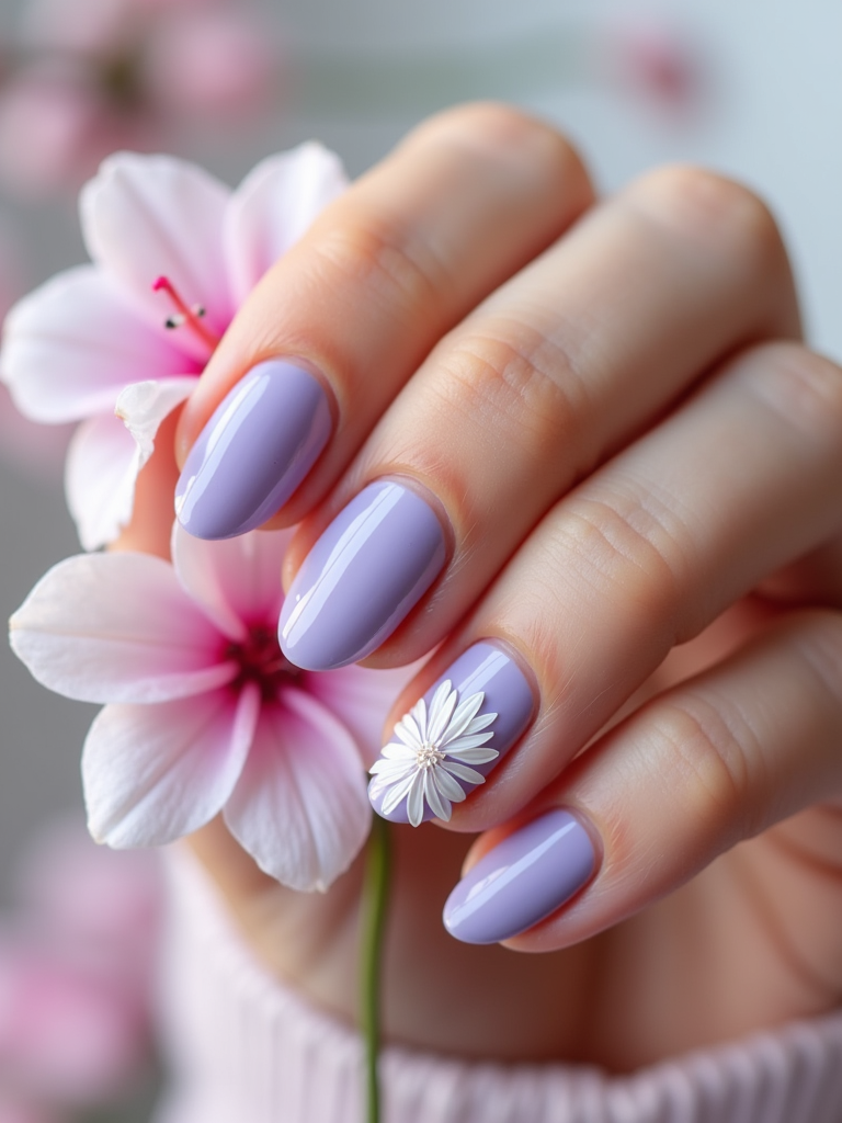 lavender nails with white floral nail art, spring-themed background, soft natural light, close-up of fingers holding a flower, Instagram-ready shot