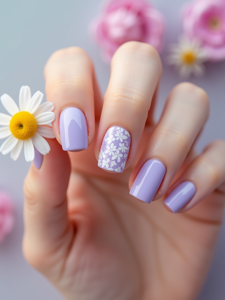 lavender nails with white floral nail art, spring-themed background, soft natural light, close-up of fingers holding a flower, Instagram-ready shot