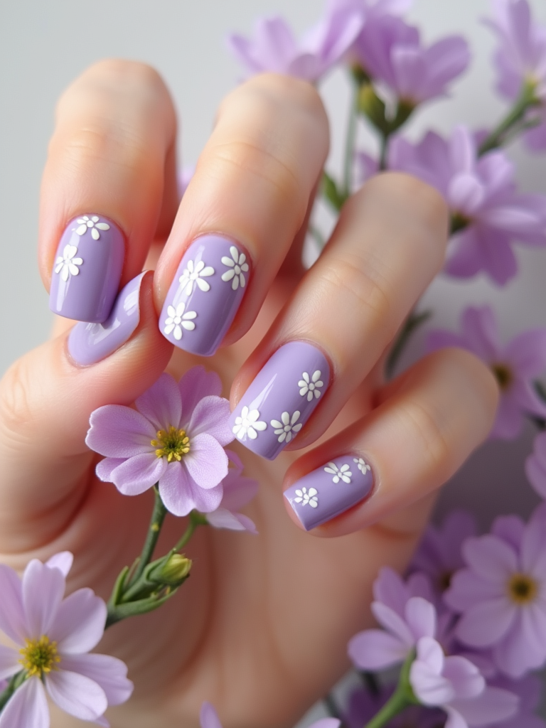 lavender nails with white floral nail art, spring-themed background, soft natural light, close-up of fingers holding a flower, Instagram-ready shot