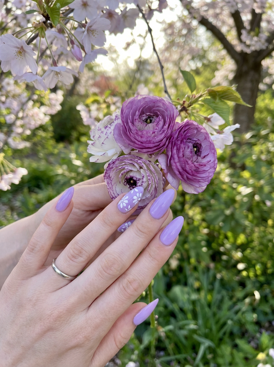 lavender nails with white floral nail art, spring-themed background, soft natural light, close-up of fingers holding a flower, Instagram-ready shot