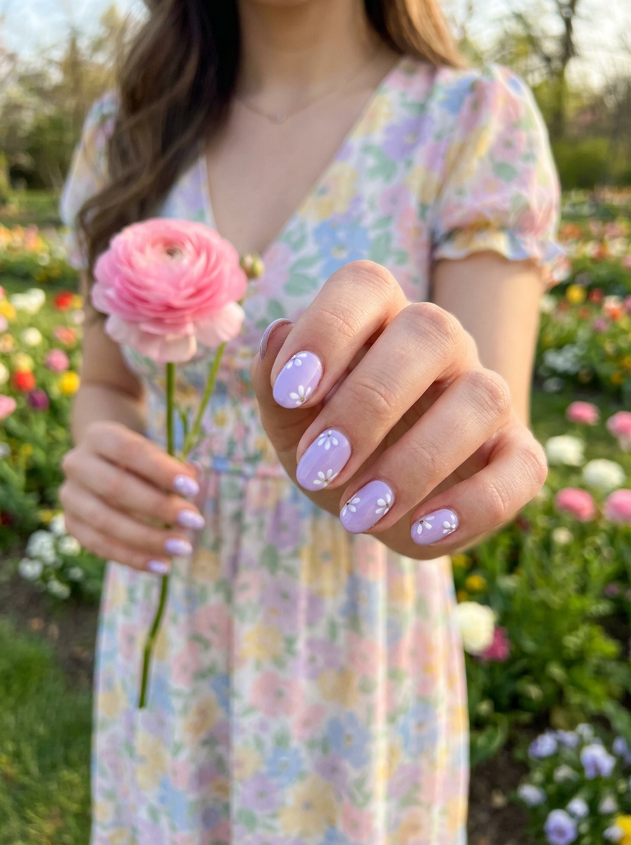 lavender nails with white floral nail art, spring-themed background, soft natural light, close-up of fingers holding a flower, Instagram-ready shot