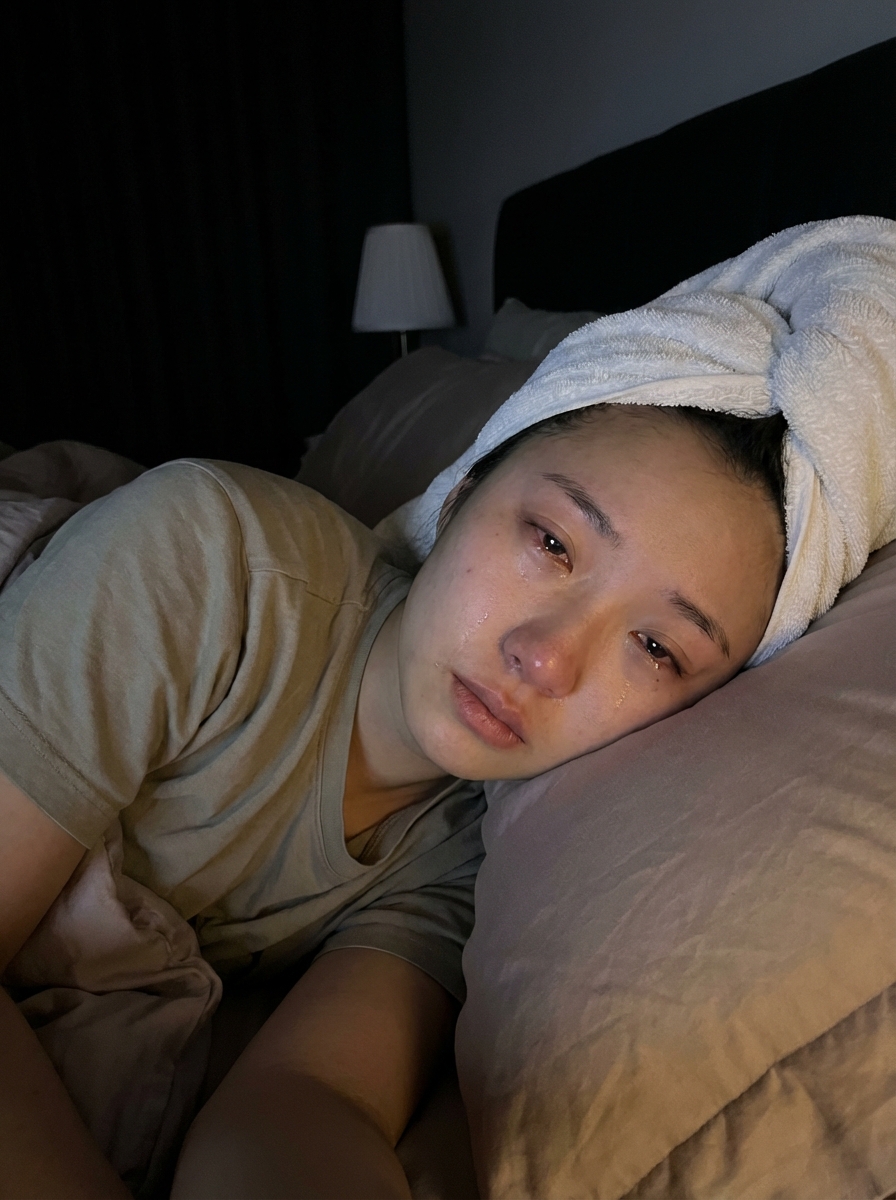 {"lighting": {"source": "Low artificial indoor light, likely from a faint room lamp or ambient night light", "quality": "Very dim, soft and subdued with gentle illumination on the face and upper body", "shadows": "Soft and subtle, minimal contrast, blending into the dark background", "direction": "From above and slightly to the side, casting gentle shadows along the jawline and under the chin"}, "background": {"context": "Intimate bedroom at night, person lying in bed with head on pillows", "setting": "Personal bedroom, cozy and dimly lit atmosphere", "elements": ["Dark, almost background with no visible details", "pillows propping up the head, soft and plush", "bedsheets partially visible around the neck and shoulders"]}, "typography": {"details": [], "text_visible": "No"}, "composition": {"framing": "Close-up vertical portrait, focused on face and upper shoulders", "perspective": "Slightly overhead and angled from the front, capturing the subject in profile view turned toward the camera", "depth_of_field": "Shallow, sharp focus on face and towel, background softly blurred", "rule_of_thirds": "Eyes and face aligned along the upper third, creating emotional balance", "subject_placement": "Centered with face slightly off to the left, drawing gaze inward"}, "color_profile": {"contrast": "Low to moderate, soft lighting emphasizing emotional subtlety", "saturation": "Very low, desaturated and monochromatic tones", "color_palette": "Cool and muted with emphasis on whites and shadows", "dominant_colors": ["Pale with subtle pink flush on cheeks and around eyes", "hair partially visible under towel", "Pure towel turban and t-shirt", "Deep black/dark gray background", "Soft from pillows and sheets"]}, "technical_specs": {"focus": "Sharp on eyes, tears, and facial contour s; soft on fabric textures", "exposure": "Slightly underexposed to enhance intimacy, face gently lit", "lens_type": "Wide-angle smartphone rear or front camera (minimal distortion)", "resolution": "High-resolution smartphone photo", "camera_type": "Smartphone camera in portrait mode, low-light optimized"}, "subject_analysis": {"eyes": {"gaze": "Half-closed or softly gazing off-camera, conveying quiet sorrow", hair, "expression": "Watery, reddened, with tears pooling and tracing down cheeks, deep emotional vulnerability"}, "face": {"shape": "Soft oval", "makeup": "Minimal natural look, no visible makeup, skin shows natural redness and gloss from tears", "complexion": "Fair, slightly flushed on cheeks and nose, moist and glistening from crying", "expression": "Subtle pout on lips, downturned mouth, raw sadness and exhaustion"}, "hair": {hair, "style": "straight hair wrapped in a loose towel turban, no loose strands visible", "length": "Medium to long, concealed under towel"}, "pose": "Lying on side in bed, head resting on pillow, face turned slightly toward camera, relaxed and weary", "clothing": {"top": "Loose-fitting short-sleeve t-shirt, soft and slightly wrinkled", "bottom": "Not visible"}, "age_group": "Late teens to early 20s", "accessories": ["towel turban wrapped around head"], "subject_type": "young model, early 20s", "hands_gestures": "Not visible in frame"}, "artistic_elements": {"mood": "Poignant, introspective, tender sadness, post-shower vulnerability", "style": "Candid, serene low-light portrait, authentic and unretouched emotional depth", "texture": "Soft towel fabric folds, plush pillow texture, dewy skin with tear trails, subtle fabric creases on shirt"}, "generation_parameters": {"seed": "Random", "model": "Photorealistic low-light portrait", "prompt": "Vertical 9:16 smartphone portrait of a young model lying on her side in a dark bedroom at night, head resting on a pillow, looking softly toward the camera with a sad, vulnerable expression. Visible tears on her cheeks, reddened watery light eyes half-closed, subtle pout on lips. hair wrapped in a loose towel turban. Wearing a loose t-shirt. Very dim soft lighting with gentle shadows, dark background with pillows and sheets. Raw, emotional, intimate, unfiltered mood. Natural with flush from crying, no makeup. Authentic low-light smartphone photo aesthetic, serene and melancholic.", "negative_prompt": "bright lighting, outdoor scene, heavy makeup, smiling, energetic pose, jewelry, accessories beyond towel, harsh shadows, high contrast, filtered effects, overexposed whites, multiple subjects, dynamic angles, text or overlays"}, "aspect_ratio": "9:16"}