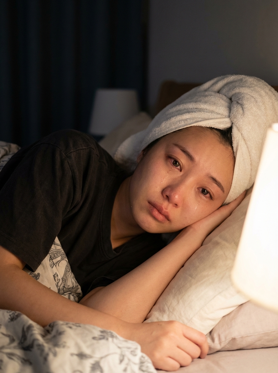 {"lighting": {"source": "Low artificial indoor light, likely from a faint room lamp or ambient night light", "quality": "Very dim, soft and subdued with gentle illumination on the face and upper body", "shadows": "Soft and subtle, minimal contrast, blending into the dark background", "direction": "From above and slightly to the side, casting gentle shadows along the jawline and under the chin"}, "background": {"context": "Intimate bedroom at night, person lying in bed with head on pillows", "setting": "Personal bedroom, cozy and dimly lit atmosphere", "elements": ["Dark, almost background with no visible details", "pillows propping up the head, soft and plush", "bedsheets partially visible around the neck and shoulders"]}, "typography": {"details": [], "text_visible": "No"}, "composition": {"framing": "Close-up vertical portrait, focused on face and upper shoulders", "perspective": "Slightly overhead and angled from the front, capturing the subject in profile view turned toward the camera", "depth_of_field": "Shallow, sharp focus on face and towel, background softly blurred", "rule_of_thirds": "Eyes and face aligned along the upper third, creating emotional balance", "subject_placement": "Centered with face slightly off to the left, drawing gaze inward"}, "color_profile": {"contrast": "Low to moderate, soft lighting emphasizing emotional subtlety", "saturation": "Very low, desaturated and monochromatic tones", "color_palette": "Cool and muted with emphasis on whites and shadows", "dominant_colors": ["Pale with subtle pink flush on cheeks and around eyes", "hair partially visible under towel", "Pure towel turban and t-shirt", "Deep black/dark gray background", "Soft from pillows and sheets"]}, "technical_specs": {"focus": "Sharp on eyes, tears, and facial contour s; soft on fabric textures", "exposure": "Slightly underexposed to enhance intimacy, face gently lit", "lens_type": "Wide-angle smartphone rear or front camera (minimal distortion)", "resolution": "High-resolution smartphone photo", "camera_type": "Smartphone camera in portrait mode, low-light optimized"}, "subject_analysis": {"eyes": {"gaze": "Half-closed or softly gazing off-camera, conveying quiet sorrow", hair, "expression": "Watery, reddened, with tears pooling and tracing down cheeks, deep emotional vulnerability"}, "face": {"shape": "Soft oval", "makeup": "Minimal natural look, no visible makeup, skin shows natural redness and gloss from tears", "complexion": "Fair, slightly flushed on cheeks and nose, moist and glistening from crying", "expression": "Subtle pout on lips, downturned mouth, raw sadness and exhaustion"}, "hair": {hair, "style": "straight hair wrapped in a loose towel turban, no loose strands visible", "length": "Medium to long, concealed under towel"}, "pose": "Lying on side in bed, head resting on pillow, face turned slightly toward camera, relaxed and weary", "clothing": {"top": "Loose-fitting short-sleeve t-shirt, soft and slightly wrinkled", "bottom": "Not visible"}, "age_group": "Late teens to early 20s", "accessories": ["towel turban wrapped around head"], "subject_type": "young model, early 20s", "hands_gestures": "Not visible in frame"}, "artistic_elements": {"mood": "Poignant, introspective, tender sadness, post-shower vulnerability", "style": "Candid, serene low-light portrait, authentic and unretouched emotional depth", "texture": "Soft towel fabric folds, plush pillow texture, dewy skin with tear trails, subtle fabric creases on shirt"}, "generation_parameters": {"seed": "Random", "model": "Photorealistic low-light portrait", "prompt": "Vertical 9:16 smartphone portrait of a young model lying on her side in a dark bedroom at night, head resting on a pillow, looking softly toward the camera with a sad, vulnerable expression. Visible tears on her cheeks, reddened watery light eyes half-closed, subtle pout on lips. hair wrapped in a loose towel turban. Wearing a loose t-shirt. Very dim soft lighting with gentle shadows, dark background with pillows and sheets. Raw, emotional, intimate, unfiltered mood. Natural with flush from crying, no makeup. Authentic low-light smartphone photo aesthetic, serene and melancholic.", "negative_prompt": "bright lighting, outdoor scene, heavy makeup, smiling, energetic pose, jewelry, accessories beyond towel, harsh shadows, high contrast, filtered effects, overexposed whites, multiple subjects, dynamic angles, text or overlays"}, "aspect_ratio": "9:16"}