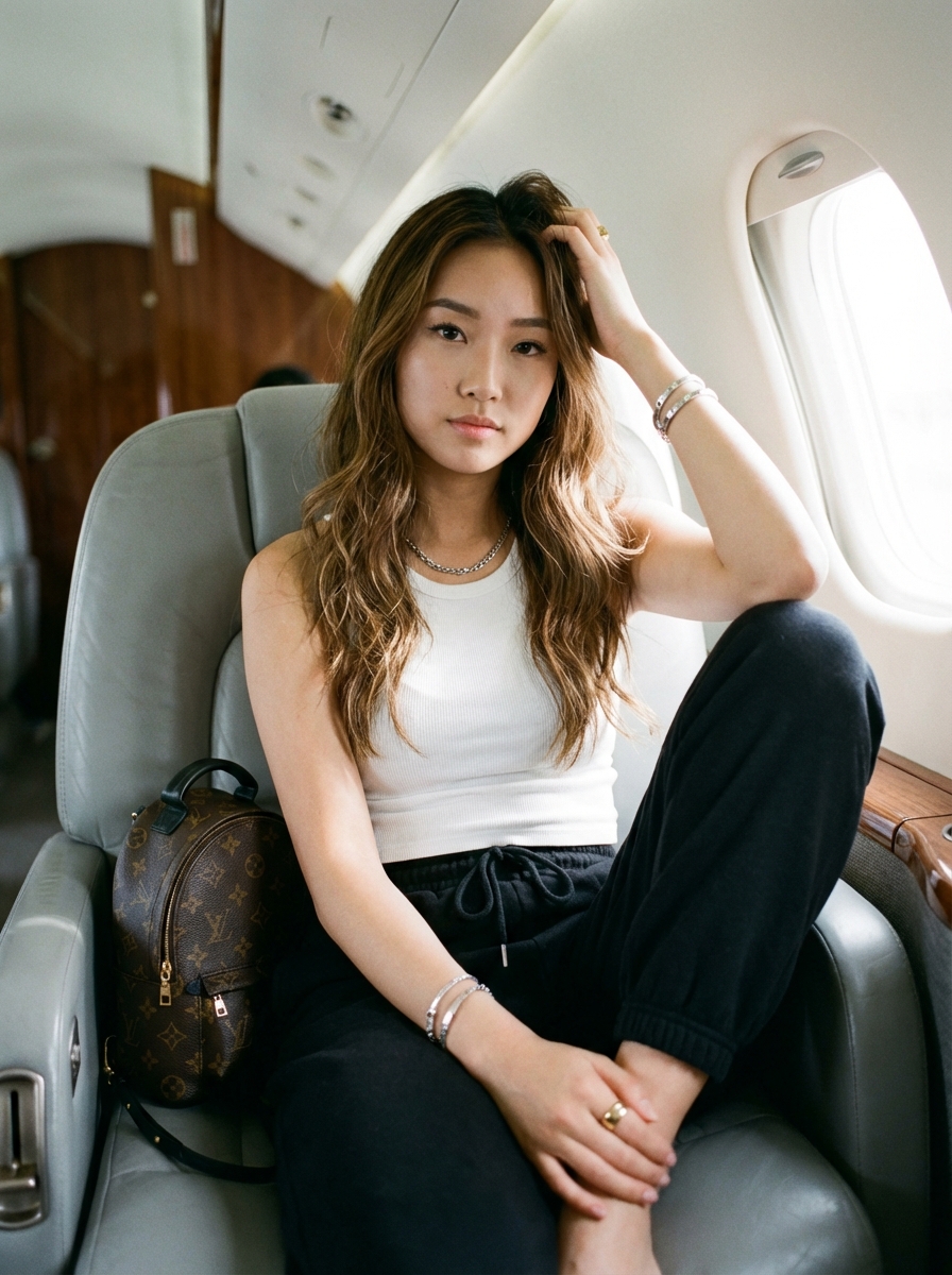 {"lighting": {"source": "Natural daylight", "quality": "Soft, diffused, creating gentle highlights on the subject's hair and arm", "shadows": "Soft shadows cast by the subject and seats, defining depth", "exposure": "Well-exposed, with slight overexposure from the window", "direction": "From the right, through the aircraft window"}, "background": {"context": "High-end travel environment", "setting": "Interior of a private jet", "elements": "Grey leather passenger seat, aircraft window with bright daylight, paneling, seatbelt buckle, blurred view of the opposite seat and cabin"}, "typography": {"alignment": "N/A", "font_size": "N/A", "font_color": "N/A", "font_family": "N/A", "text_content": "None"}, "composition": {"balance": "Asymmetrical, weighted towards the right by the subject and window", "framing": "Medium shot, slightly wide", "focal_point": "the model's face and upper body", "aspect_ratio": "9:16 (vertical)", "camera_angle": "Eye-level", "depth_of_field": "Shallow, with the background interior slightly blurred", "rule_of_thirds": "Subject's eyes are on the top horizontal line, her body follows the right vertical line"}, "color_profile": {"palette": "Warm and neutral tones", "vibrance": "Slightly muted, natural", "saturation": "Moderate", "accent_colors": ["#D2B48C", "#F5F5DC"], "color_contrast": "High contrast between the top/window and pants", "dominant_colors": ["#FFFFFF", "#000000", "#8B4513", "#A9A9A9"]}, "technical_specs": {"iso": "200", "lens": "Wide-angle or standard lens, around 35mm or 50mm", "focus": "Sharp on the subject, softer on the background", "camera": "Likely a smartphone or DSLR", "aperture": "f/2.8", "shutter_speed": "1/250s"}, "subject_analysis": {"face": "Looking directly at the camera, neutral expression, full lips, defined eyebrows", "hair": "Long, dark brown, wavy, falling over shoulders", "pose": "Sitting, left hand touching her hair near the top of her head, right hand resting on her knee with fingers curled, body angled slightly left", "skin": "Tanned, smooth complexion", "nails": "Long, pointed, pink and ombre manicure", "person": "young model, early 20s", "clothing": "ribbed tank top , drawstring sweatpants", "accessories": "Silver chain necklace, multiple silver bracelets on left wrist, gold ring on right hand, if(gender=f){hoop earrings } , Louis Vuitton monogram backpack"}, "artistic_elements": {"mood": "Relaxed, casual, luxurious", "style": "Candid, lifestyle photography", "texture": "Smoothness of leather and skin, softness of fabric, reflective quality of jewelry and window glass", "narrative": "A glimpse into a luxurious travel moment"}, "generation_parameters": {"prompt": "A candid lifestyle photo of a young model with long, wavy brown hair sitting in a private jet. She is wearing a ribbed tank top , drawstring sweatpants, a silver necklace, and bracelets. Her left hand is touching her hair, and her right hand rests on her knee with a gold ring. A Louis Vuitton backpack is beside her. Natural daylight streams in from the aircraft window on the right. The leather seats are grey. Medium shot, eye-level angle, natural film grain. The mood is relaxed and luxurious."}}