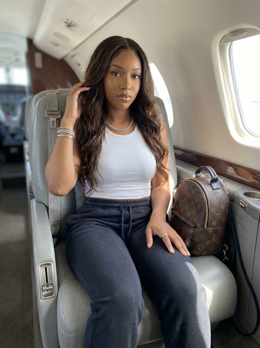 {"lighting": {"source": "Natural daylight", "quality": "Soft, diffused, creating gentle highlights on the subject's hair and arm", "shadows": "Soft shadows cast by the subject and seats, defining depth", "exposure": "Well-exposed, with slight overexposure from the window", "direction": "From the right, through the aircraft window"}, "background": {"context": "High-end travel environment", "setting": "Interior of a private jet", "elements": "Grey leather passenger seat, aircraft window with bright daylight, paneling, seatbelt buckle, blurred view of the opposite seat and cabin"}, "typography": {"alignment": "N/A", "font_size": "N/A", "font_color": "N/A", "font_family": "N/A", "text_content": "None"}, "composition": {"balance": "Asymmetrical, weighted towards the right by the subject and window", "framing": "Medium shot, slightly wide", "focal_point": "the model's face and upper body", "aspect_ratio": "9:16 (vertical)", "camera_angle": "Eye-level", "depth_of_field": "Shallow, with the background interior slightly blurred", "rule_of_thirds": "Subject's eyes are on the top horizontal line, her body follows the right vertical line"}, "color_profile": {"palette": "Warm and neutral tones", "vibrance": "Slightly muted, natural", "saturation": "Moderate", "accent_colors": ["#D2B48C", "#F5F5DC"], "color_contrast": "High contrast between the top/window and pants", "dominant_colors": ["#FFFFFF", "#000000", "#8B4513", "#A9A9A9"]}, "technical_specs": {"iso": "200", "lens": "Wide-angle or standard lens, around 35mm or 50mm", "focus": "Sharp on the subject, softer on the background", "camera": "Likely a smartphone or DSLR", "aperture": "f/2.8", "shutter_speed": "1/250s"}, "subject_analysis": {"face": "Looking directly at the camera, neutral expression, full lips, defined eyebrows", "hair": "Long, dark brown, wavy, falling over shoulders", "pose": "Sitting, left hand touching her hair near the top of her head, right hand resting on her knee with fingers curled, body angled slightly left", "skin": "Tanned, smooth complexion", "nails": "Long, pointed, pink and ombre manicure", "person": "young model, early 20s", "clothing": "ribbed tank top , drawstring sweatpants", "accessories": "Silver chain necklace, multiple silver bracelets on left wrist, gold ring on right hand, if(gender=f){hoop earrings } , Louis Vuitton monogram backpack"}, "artistic_elements": {"mood": "Relaxed, casual, luxurious", "style": "Candid, lifestyle photography", "texture": "Smoothness of leather and skin, softness of fabric, reflective quality of jewelry and window glass", "narrative": "A glimpse into a luxurious travel moment"}, "generation_parameters": {"prompt": "A candid lifestyle photo of a young model with long, wavy brown hair sitting in a private jet. She is wearing a ribbed tank top , drawstring sweatpants, a silver necklace, and bracelets. Her left hand is touching her hair, and her right hand rests on her knee with a gold ring. A Louis Vuitton backpack is beside her. Natural daylight streams in from the aircraft window on the right. The leather seats are grey. Medium shot, eye-level angle, natural film grain. The mood is relaxed and luxurious."}}