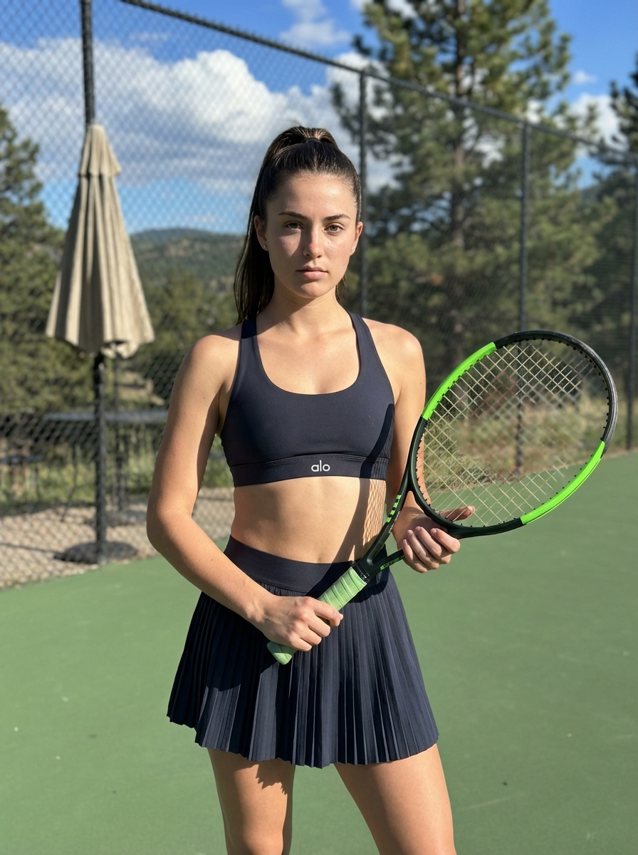 {"lighting": {"type": "Natural sunlight", "shadows": "Strong, distinct shadows cast by the subject, racquet, and umbrella", "direction": "From the upper right, slightly back", "intensity": "Bright and harsh", "highlights": "Bright highlights on the subject's skin, hair, and the tennis net"}, "background": {"setting": "Outdoor tennis court", "elements": ["Green hardcourt surface with lines", "chain-link fence", "Tennis net in the foreground", "Large patio umbrella behind the fence", "Tall pine tree and other trees in the mid-ground", "Hills in the far background", "Blue sky with fluffy clouds"], "environment": "Sunny, warm outdoor setting during the day"}, "typography": {hair, "placement": "Center of the sports bra ", "font_style": "Minimalist sans-serif logo", "text_content": "alo"}, "composition": {"focus": "Sharp focus on the subject and tennis racquet", "balance": "Symmetrical", "framing": "Waist-up view", "shot_type": "Medium shot", "depth_of_field": "Shallow, background slightly blurred", "subject_position": "Centered"}, "color_profile": {"vibrance": "High", "saturation": "Moderate", "dominant_colors": [{"hex": "#2F2F2F", "name": "Dark Charcoal"}, {"hex": "#2E4A33", "name": "Forest Green"}, {"hex": "#6DA7D7", "name": "Sky Blue"}, {"hex": "#C59E8A", "name": " Tone"}, {"hex": "#FFFFFF", "name": "White"}], "palette_description": "High contrast natural palette with deep blacks, vibrant greens and blues, and warm skin tones."}, "technical_specs": {"iso": "100-200 (estimated)", "aperture": "f/4.0-f/5.6 (estimated)", "lens_type": "Standard zoom", "camera_type": "DSLR or high-end mirrorless", "image_quality": "High resolution, sharp details, clear rendering", "shutter_speed": "1/500s (estimated)"}, "subject_analysis": {"hair": "Dark hair tied up in a high ponytail with a few loose strands framing her face", "pose": "Standing, body angled slightly to the right, holding a tennis racquet across her body with both hands", "clothing": {"top": "sports bra with 'alo' logo", "bottom": "pleated if(gender=f){tennis skirt } with and waistband", "accessories": "None visible"}, "expression": "Serious, direct gaze at the camera", "subject_type": "young model", "physical_features": ", light-colored eyes, fit physique"}, "artistic_elements": {"mood": "Confident, active, sunny", "style": "Outdoor lifestyle portrait", "texture": "Smooth skin, fabric texture of clothing, rough texture of court and fence", "composition_rule": "Rule of thirds, with the subject's face and the racquet intersecting guide lines"}, "generation_parameters": {"prompt": "A candid outdoor portrait of a young model in tennis attire (sports bra , if(gender=f){pleated skirt } ) holding a green and tennis racquet on a sunlit tennis court. She has a high ponytail and a serious expression, looking directly at the camera. The background features a fence, umbrella, trees, hills, and a partly cloudy blue sky. The lighting is bright natural sunlight creating strong shadows.", "aspect_ratio": "2:3", "style_preset": "Photographic", "negative_prompt": "Indoor, night, low light, blurry, out of focus, multiple subjects, winter"}}