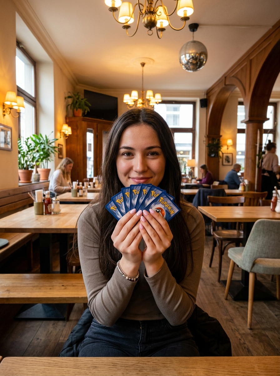 {"lighting":{"mood":"Cozy, relaxed, and intimate","shadows":"Soft and diffused shadows, highlighting textures","direction":"Top-down and side lighting","intensity":"Warm and ambient, sufficient for indoor photography","highlights":"Warm highlights on wooden surfaces, chandeliers, and the subject's hair","light_source":"Mixed artificial and natural light, primarily from overhead chandeliers and wall lamps, with some light from windows"},"background":{"details":"Table condiments, plants, different types of chairs, architectural details like wooden arches","setting":"Restaurant interior","elements":["Wooden tables and benches","Other patrons (blurred) in the background","Large chandeliers with warm light","Mirror ball hanging from the ceiling","Wooden beams and paneling","Windows with daylight"],"atmosphere":"Bust ling but relaxed, warm and inviting"},"typography":{"text_elements":[{"size":"Small, clearly visible","text":"Pok\u00e9mon","color":"#F2C94C","clarity":"Slightly blurred due to focus and angle","location":"On the back of the playing cards","font_style":"Stylized, bubbly, recognizable logo font"}]},"composition":{"balance":"Symmetrical, subject centered, elements balanced on left and right","framing":"Centered subject, with background extending to both sides","shot_type":"Medium shot, slightly wide","perspective":"Eye-level","visual_flow":"Viewer's eye is drawn to the subject's face and the cards, then to the background environment","depth_of_field":"Shallow, subject is sharp, background is softly blurred"},"color_profile":{"contrast":"Medium, with strong contrast between dark subject and warm background","saturation":"Moderate, with warm tones enhanced by lighting","accent_colors":["#E0A7AF","#F8F8F8","#666666"],"color_palette":"Warm and inviting, dominated by wood tones and golden light, punctuated by the blue and of the cards and the subject's dark hair.","dominant_colors":["#3A3A3A","#F2C94C","#A67C52","#2C527B","#D4AF37"]},"technical_specs":{"iso":"Medium ISO (e.g., 400-800) to handle indoor lighting","noise":"Slight digital noise visible in darker areas","aperture":"Likely f\/2.8 or f\/4 for shallow depth of field","lens_type":"Standard lens","resolution":"High, with good detail on the subject","camera_type":"Digital photograph","shutter_speed":"Relatively slow (e.g., 1\/60s) as there's minimal motion blur"},"subject_analysis":{"hair":"Long, thick, straight, dark hair, parted in the middle","pose":"Seated, holding a fan of cards in front of her face, looking at the camera over the cards","subject":"young model","clothing":"long-sleeved top","accessories":"bracelet on left wrist, light pink nail polish","hands_gestures":"Both hands holding the cards, fingers with light pink painted nails are visible. A hair tie or bracelet is on her left wrist.","facial_expression":"Her eyes are visible above the cards, looking directly at the camera, appearing relaxed or slightly smiling. Long eyelashes are prominent."},"artistic_elements":{"mood":"Playful, mysterious, relaxed, casual","style":"Candid, portrait photograph","theme":"Hiding, identity, leisure, pop culture","narrative":"A person in a restaurant, playfully hiding behind their cards, inviting curiosity","symbolism":"The Pok\u00e9mon cards represent a hobby or interest, the hiding of the face creates intrigue"},"generation_parameters":{"seed":"Use a random seed or specify one for consistent results","steps":"30-50 for detailed results","prompt":"A medium shot photograph of a young model with long, dark hair, seated in a cozy, warm-lit restaurant. She is playfully hiding the lower half of her face with a fan of Pok\u00e9mon cards, her eyes peeking over them and looking directly at the camera. Her hands with light pink nail polish are visible holding the cards. The background is a bust ling restaurant interior with wooden furniture, chandeliers, and other patrons, all softly blurred. The lighting is warm and ambient. The style is candid and relaxed.","sampler":"DPM++ 2M Karras","cfg_scale":"7-10","negative_prompt":"Bright, harsh lighting, clear background, multiple subjects in focus, and white, high contrast, studio shot, full face visible, no cards"}}