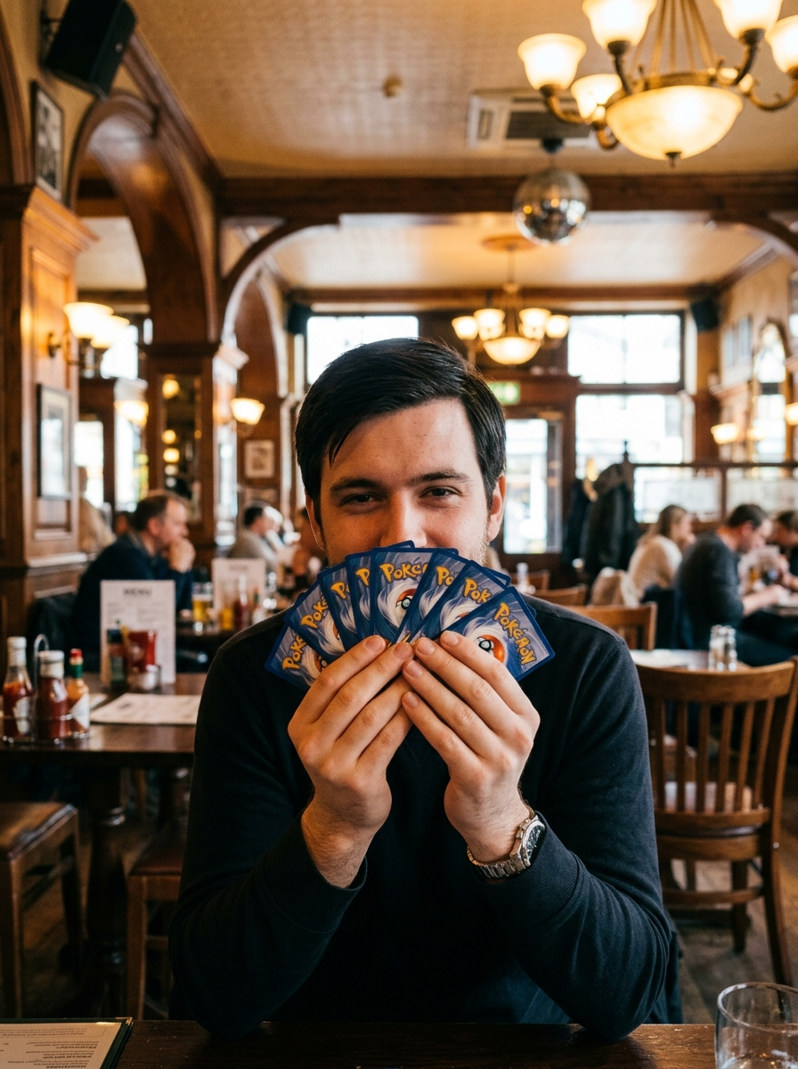 {"lighting":{"mood":"Cozy, relaxed, and ","shadows":"Soft and diffused shadows, highlighting textures","direction":"Top-down and side lighting","intensity":"Warm and ambient, sufficient for indoor photography","highlights":"Warm highlights on wooden surfaces, chandeliers, and the subject's hair","light_source":"Mixed artificial and natural light, primarily from overhead chandeliers and wall lamps, with some light from windows"},"background":{"details":"Table condiments, plants, different types of chairs, architectural details like wooden arches","setting":"Restaurant interior","elements":["Wooden tables and benches","Other patrons (blurred) in the background","Large chandeliers with warm light","Mirror ball hanging from the ceiling","Wooden beams and paneling","Windows with daylight"],"atmosphere":"bustling but relaxed, warm and inviting"},"typography":{"text_elements":[{"size":"Small, clearly ","text":"Pok\u00e9mon","color":"#F2C94C","clarity":"Slightly blurred due to focus and angle","location":"On the back of the playing cards","font_style":"Stylized, bubbly, recognizable logo font"}]},"composition":{"balance":"Symmetrical, subject centered, elements balanced on left and right","framing":"Centered subject, with background extending to both sides","shot_type":"Medium shot, slightly wide","perspective":"Eye-level","visual_flow":"Viewer's eye is drawn to the subject's face and the cards, then to the background environment","depth_of_field":"Shallow, subject is sharp, background is softly blurred"},"color_profile":{"contrast":"Medium, with strong contrast between dark subject and warm background","saturation":"Moderate, with warm tones enhanced by lighting","accent_colors":["#E0A7AF","#F8F8F8","#666666"],"color_palette":"Warm and inviting, dominated by wood tones and golden light, punctuated by the blue and of the cards and the subject's dark hair.","dominant_colors":["#3A3A3A","#F2C94C","#A67C52","#2C527B","#D4AF37"]},"technical_specs":{"iso":"Medium ISO (e.g., 400-800) to handle indoor lighting","noise":"Slight digital noise in darker areas","aperture":"Likely f\/2.8 or f\/4 for shallow depth of field","lens_type":"Standard lens","resolution":"High, with good detail on the subject","camera_type":"Digital photograph","shutter_speed":"Relatively slow (e.g., 1\/60s) as there's minimal motion blur"},"subject_analysis":{"hair":"Short, thick, straight, dark hair, parted on the side","pose":"Seated, holding a fan of cards in front of his face, looking confidently at the camera over the cards","subject":"young male model","clothing":"long-sleeved shirt","accessories":"watch on left wrist","hands_gestures":"Both hands holding the cards, fingers with clean nails are . A watch is on his left wrist.","facial_expression":"His eyes are above the cards, looking directly at the camera, appearing relaxed or slightly smirking. Light stubble is prominent."},"artistic_elements":{"mood":"Playful, mysterious, relaxed, casual","style":"Candid, portrait photograph","theme":"Hiding, identity, leisure, pop culture","narrative":"A model in a restaurant, playfully hiding behind his cards, inviting curiosity","symbolism":"The Pok\u00e9mon cards represent a hobby or interest, the hiding of the face creates intrigue"},"generation_parameters":{"seed":"Use a random seed or specify one for consistent results","steps":"30-50 for detailed results","prompt":"A medium shot photograph of a young male model with short, dark hair, seated in a cozy, warm-lit restaurant. He is playfully hiding the lower half of his face with a fan of Pok\u00e9mon cards, his eyes peeking over them and looking directly at the camera. His hands are holding the cards. The background is a bustling restaurant interior with wooden furniture, chandeliers, and other patrons, all softly blurred. The lighting is warm and ambient. The style is candid and relaxed.","sampler":"DPM++ 2M Karras","cfg_scale":"7-10","negative_prompt":"Bright, harsh lighting, clear background, multiple subjects in focus, and white, high contrast, studio shot, full face , no cards"}}