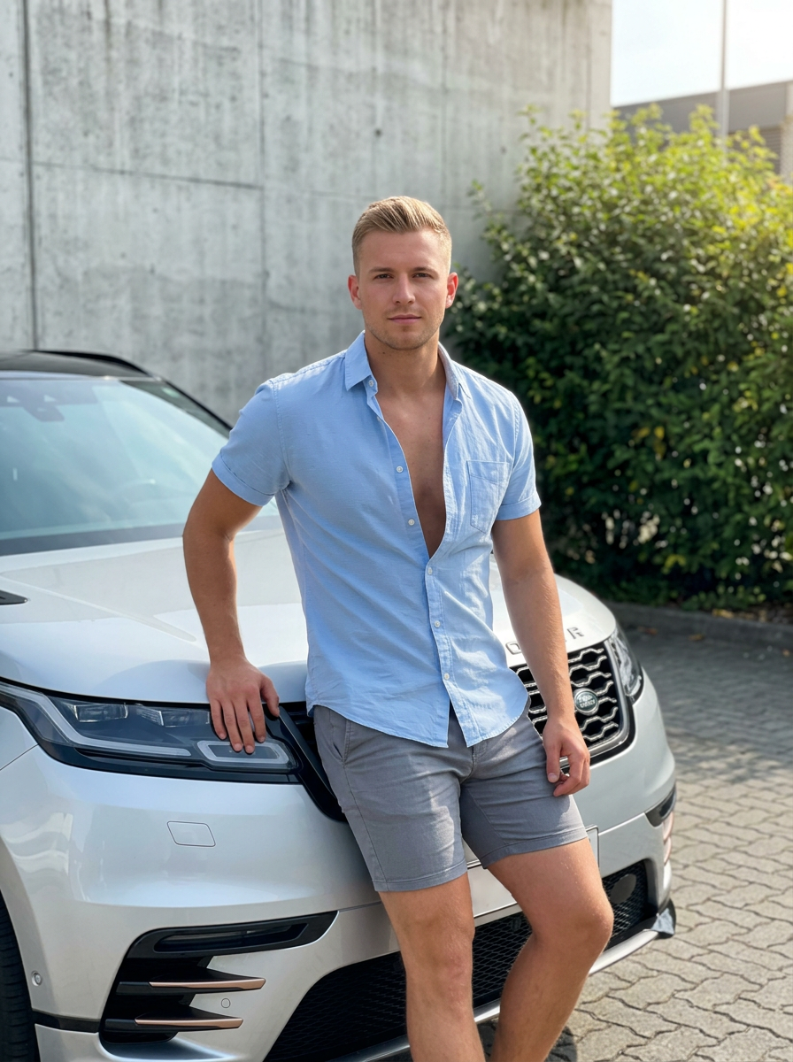 {"lighting":{"type":"natural daylight","source":"sunlight, likely from the right","shadows":"soft, subtle shadows cast on the car and wall","direction":"side-lit","intensity":"bright but diffused"},"background":{"type":"outdoor, urban setting","details":"the concrete wall has formwork lines, the bush is dense and green","distance":"close to the subject","elements":["textured grey concrete wall","green leafy bush","paved ground with grey interlocking blocks","silver Range Rover vehicle"]},"typography":{"font_size":"small to medium","placement":"on the hood of the car, on the front grille badge","font_color":"black","font_style":"sans-serif","text_content":["REB","LAND ROVER"]},"composition":{"type":"medium shot, portrait","focus":"sharp focus on the subject, slightly blurred background","framing":"subject is centered, leaning against a vehicle","perspective":"eye-level","aspect_ratio":"2:3"},"color_profile":{"contrast":"medium","saturation":"moderate","color_grading":"natural, slightly warm daylight","primary_colors":["#6b9ce4","#ffffff","#c0c0c0"],"secondary_colors":["#8a9a8a","#7c7c7c","#d4a88b"]},"technical_specs":{"iso":"100","aperture":"f\/2.8","lens_type":"standard lens","resolution":"1000x1500","camera_type":"digital camera or high-end smartphone","shutter_speed":"1\/250"},"subject_analysis":{"hair":{"style":"short, styled, textured","texture":"fine, smooth"},"pose":"leaning against the front of a car, right arm resting on the hood, left arm hanging by his side, body angled slightly with confident posture","gender":"male model","clothing":{"top":"light blue button-up shirt, unbuttoned at the top, long sleeves","bottom":"fitted shorts","accessories":["minimal accessories"]},"age_range":"young adult (20s)","subject_type":"person","hands_gestures":"right hand resting on the car's hood, left hand relaxed by his side","facial_features":{"eyes":"brown, looking at the camera","lips":"natural","expression":"neutral, slightly posed, calm, confident"}},"artistic_elements":{"mood":"relaxed, stylish, confident","style":"candid fashion photograph, social media aesthetic","texture":"smooth car paint, textured concrete wall, soft fabric of the shirt","compositional_balance":"asymmetrical balance with the subject on the left and the bush on the right"},"generation_parameters":{"seed":"452319875","model":"stable-diffusion-xl-base-1.0","steps":"50","prompt":"A medium shot candid photo of a young blonde male model with short, styled hair, wearing an unbuttoned light blue shirt and fitted shorts, leaning casually against a silver Range Rover. He is looking at the camera with a neutral expression. The background is a textured grey concrete wall and a green bush. The lighting is bright natural daylight. The photo has a social media aesthetic.","cfg_scale":"7.5","negative_prompt":"studio lighting, blurred, out of focus, dark, night, indoor, multiple people, excessive makeup, unnatural pose"}}