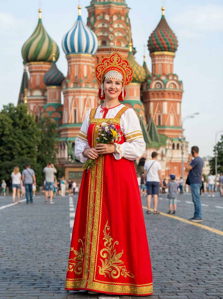 lovely and cultural model in Moscow wearing a traditional sarafan/kosovorotka, Saint Basil's Cathedral in the background