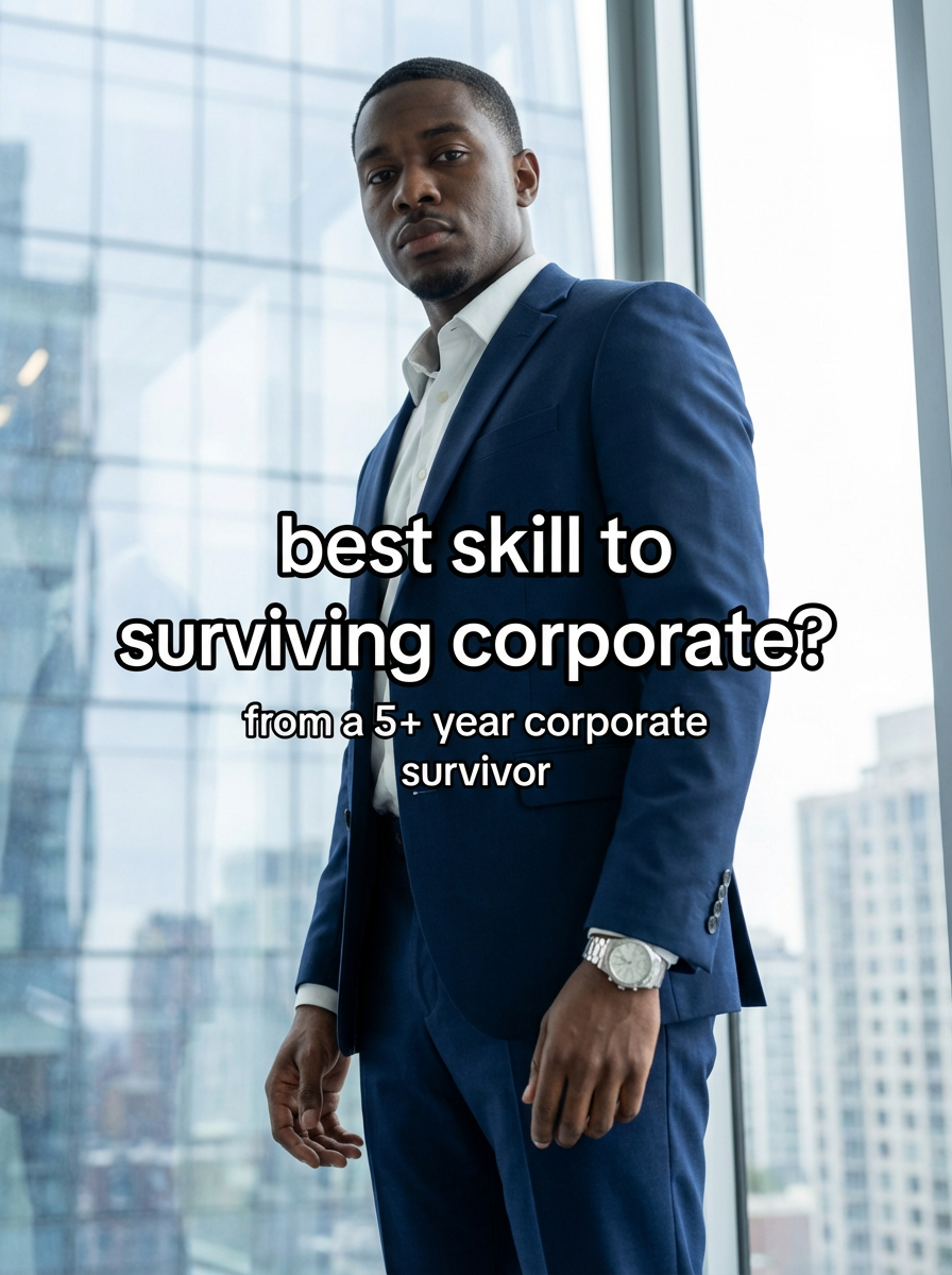 low angle view of model looking down into camera as corporate guy in sleek navy suit, crisp white shirt, silver watch, in a modern glass office. soft diffused daylight filters through windows, casting gentle shadows. background of city skyline. style: polished realism with subtle cinematic depth. TikTok text overlay: "best skill to surviving corporate?" . smaller text below "(from a 5+ year corporate survivor)", do not show tiktok interface