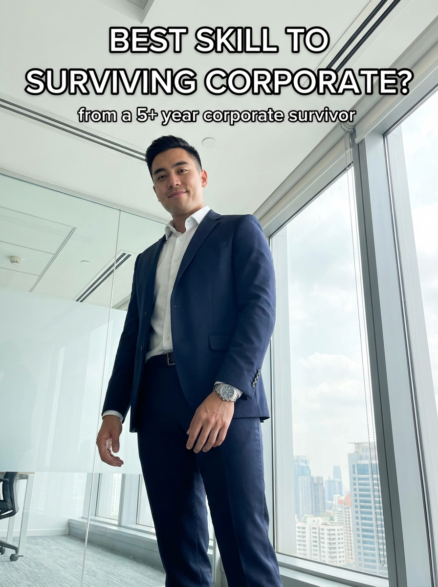 low angle view of model looking down into camera as corporate guy in sleek navy suit, crisp white shirt, silver watch, in a modern glass office. soft diffused daylight filters through windows, casting gentle shadows. background of city skyline. style: polished realism with subtle cinematic depth. TikTok TikTok-style text overlay with white text with black outline: "best skill to surviving corporate?" . smaller text below "(from a 5+ year corporate survivor)", do not show tiktok interface or logo