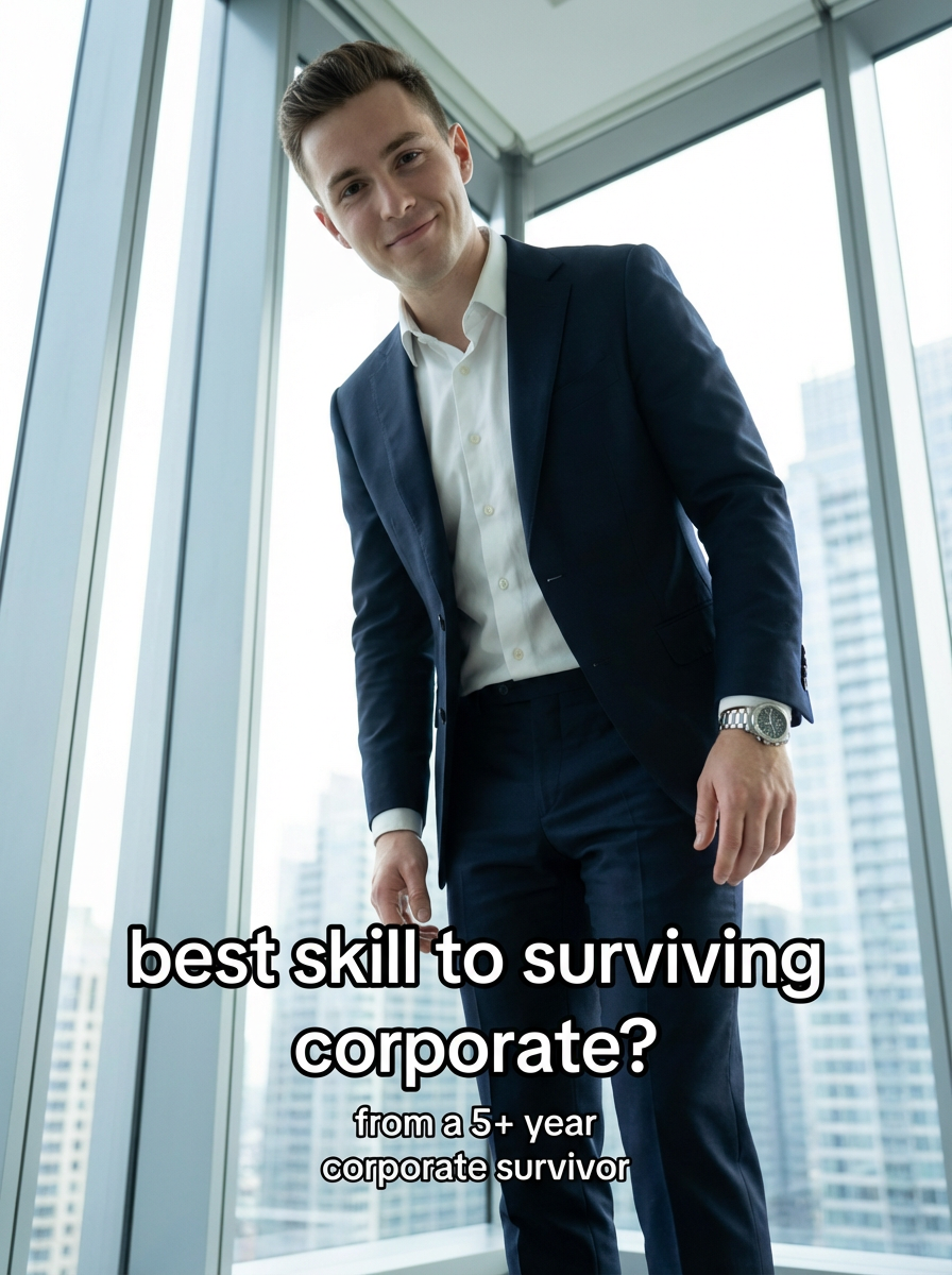 low angle view of model looking down into camera as corporate guy in sleek navy suit, crisp white shirt, silver watch, in a modern glass office. soft diffused daylight filters through windows, casting gentle shadows. background of city skyline. style: polished realism with subtle cinematic depth. TikTok TikTok-style text overlay with white text with black outline: "best skill to surviving corporate?" . smaller text below "(from a 5+ year corporate survivor)", do not show tiktok interface or logo