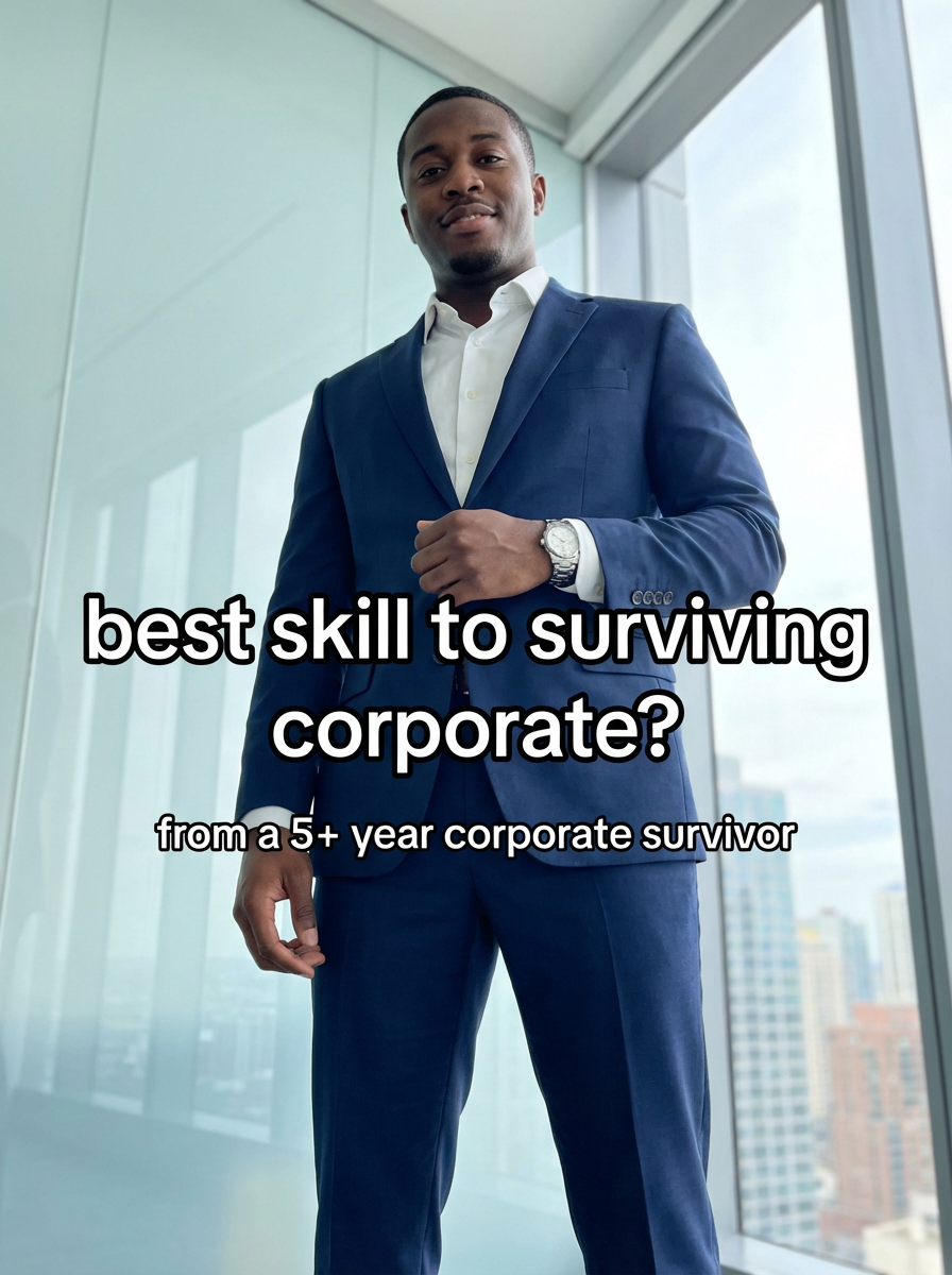 low angle view of model looking down into camera as corporate guy in sleek navy suit, crisp white shirt, silver watch, in a modern glass office. soft diffused daylight filters through windows, casting gentle shadows. background of city skyline. style: polished realism with subtle cinematic depth. TikTok TikTok-style text overlay with white text with black outline: "best skill to surviving corporate?" . smaller text below "(from a 5+ year corporate survivor)", do not show tiktok interface or logo
