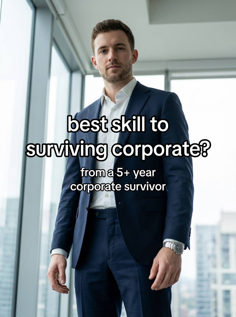 low angle view of model looking down into camera as corporate guy in sleek navy suit, crisp white shirt, silver watch, in a modern glass office. soft diffused daylight filters through windows, casting gentle shadows. background of city skyline. style: polished realism with subtle cinematic depth. TikTok-style text overlay with white text with black outline: "best skill to surviving corporate?" . smaller text below "(from a 5+ year corporate survivor)", do not show tiktok interface or logo
