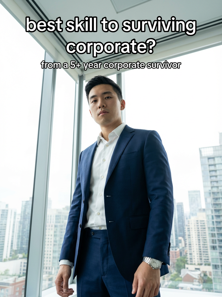 low angle view of model looking down into camera as corporate guy in sleek navy suit, crisp white shirt, silver watch, in a modern glass office. soft diffused daylight filters through windows, casting gentle shadows. background of city skyline. style: polished realism with subtle cinematic depth. TikTok-style text overlay with white text with black outline: "best skill to surviving corporate?" . smaller text below "(from a 5+ year corporate survivor)", do not show tiktok interface or logo