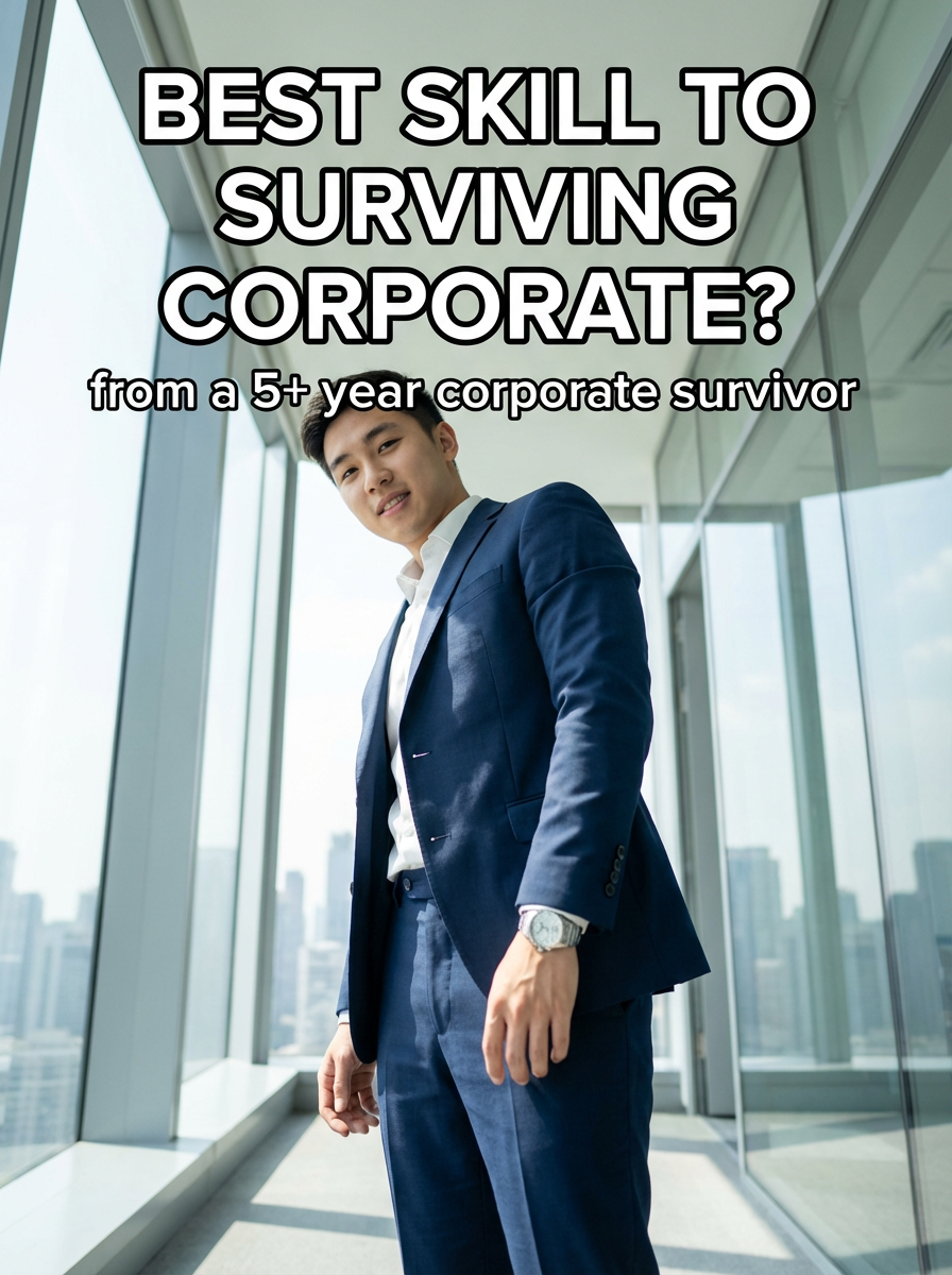 low angle view of model looking down into camera as corporate guy in sleek navy suit, crisp white shirt, silver watch, in a modern glass office. soft diffused daylight filters through windows, casting gentle shadows. background of city skyline. style: polished realism with subtle cinematic depth. TikTok-style text overlay with white text with black outline: "best skill to surviving corporate?" . smaller text below "(from a 5+ year corporate survivor)", do not show tiktok interface or logo