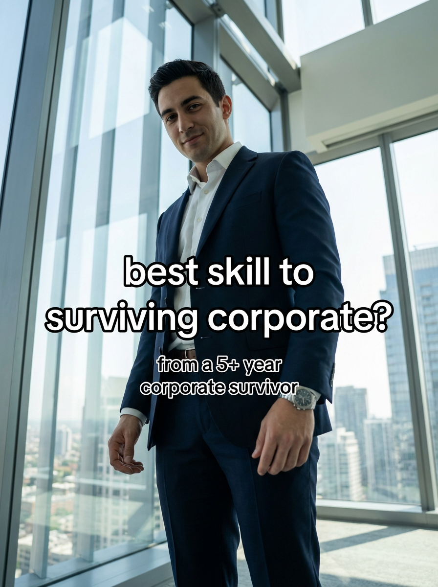 low angle view of model looking down into camera as corporate guy in sleek navy suit, crisp white shirt, silver watch, in a modern glass office. soft diffused daylight filters through windows, casting gentle shadows. background of city skyline. style: polished realism with subtle cinematic depth. TikTok-style text overlay with white text with black outline: "best skill to surviving corporate?" . smaller text below "(from a 5+ year corporate survivor)", do not show tiktok interface or logo