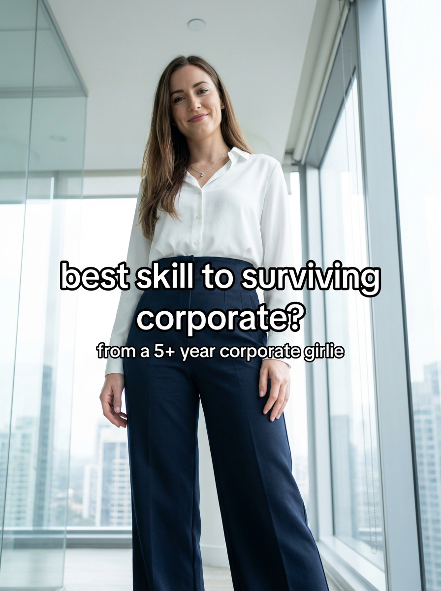 low angle view of model looking down into camera as corporate girlie in sleek high‑waist navy trousers, crisp white blouse, minimalist silver necklace , in a modern glass office. soft diffused daylight filters through windows, casting gentle shadows. background of city skyline. style: polished realism with subtle cinematic depth. TikTok TikTok-style text overlay with white text with black outline: "best skill to surviving corporate?" . smaller text below "(from a 5+ year corporate girlie)" , do not show tiktok interface or logo