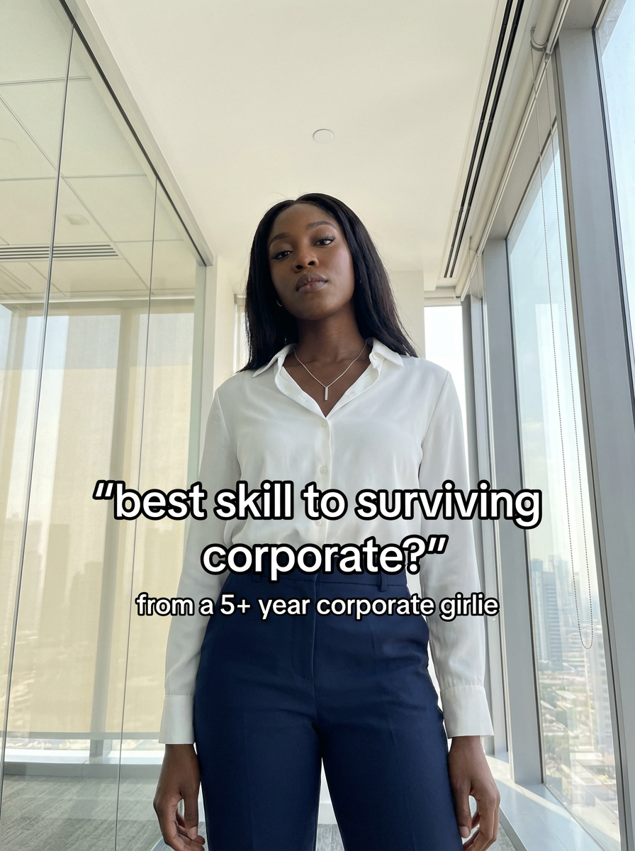 low angle view of model looking down into camera as corporate girlie in sleek high‑waist navy trousers, crisp white blouse, minimalist silver necklace , in a modern glass office. soft diffused daylight filters through windows, casting gentle shadows. background of city skyline. style: polished realism with subtle cinematic depth. TikTok TikTok-style text overlay with white text with black outline: "best skill to surviving corporate?" . smaller text below "(from a 5+ year corporate girlie)" , do not show tiktok interface or logo