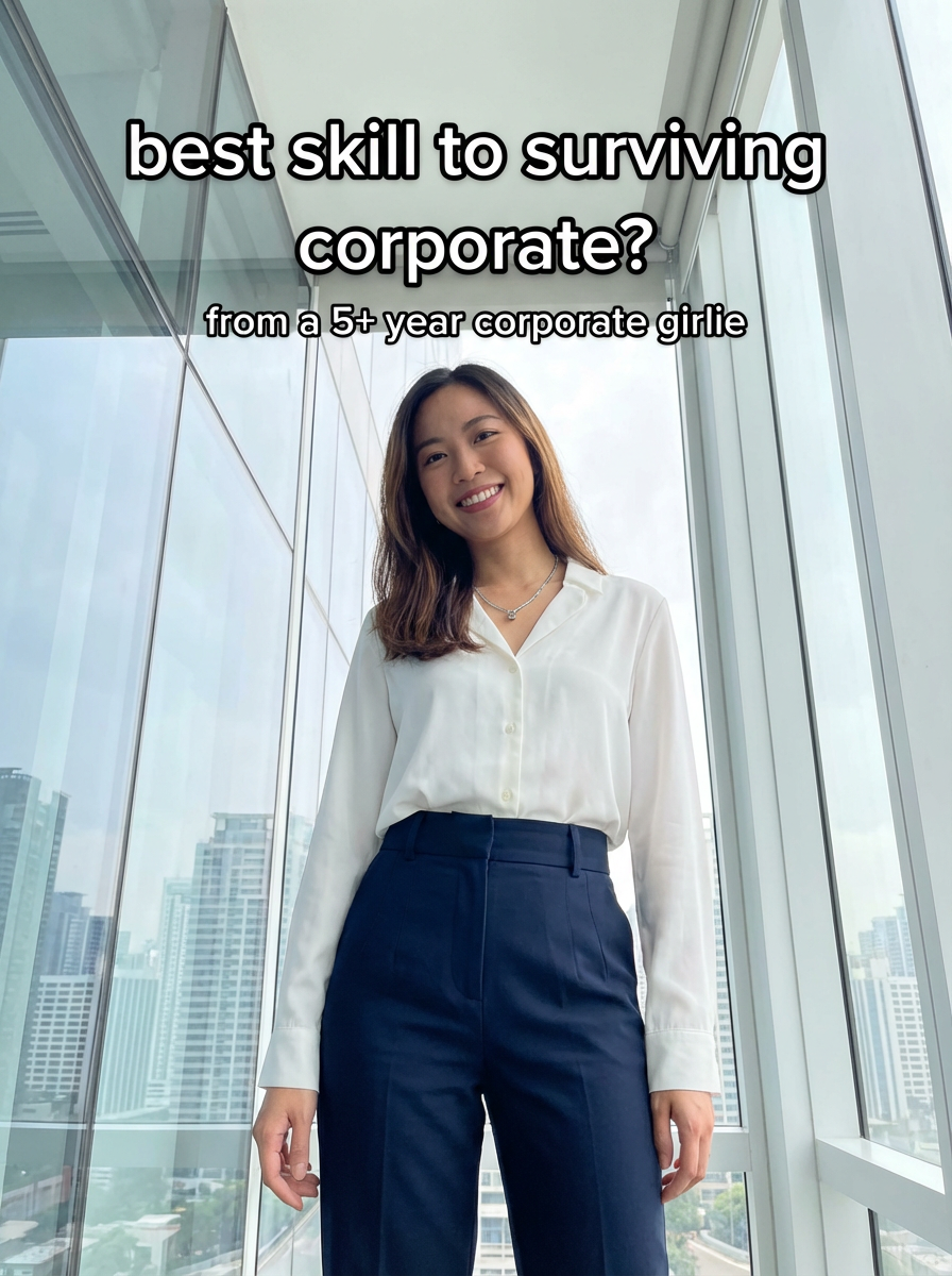 low angle view of model looking down into camera as corporate girlie in sleek high‑waist navy trousers, crisp white blouse, minimalist silver necklace , in a modern glass office. soft diffused daylight filters through windows, casting gentle shadows. background of city skyline. style: polished realism with subtle cinematic depth. TikTok-style text overlay with white text with black outline: "best skill to surviving corporate?" . smaller text below "(from a 5+ year corporate girlie)" , do not show tiktok interface or logo