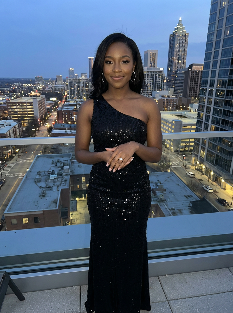 Luxury engagement photoshoot in a cityscape. Model wearing a classy evening gown . Standing on a rooftop with a skyline view, high-end engagement photography.