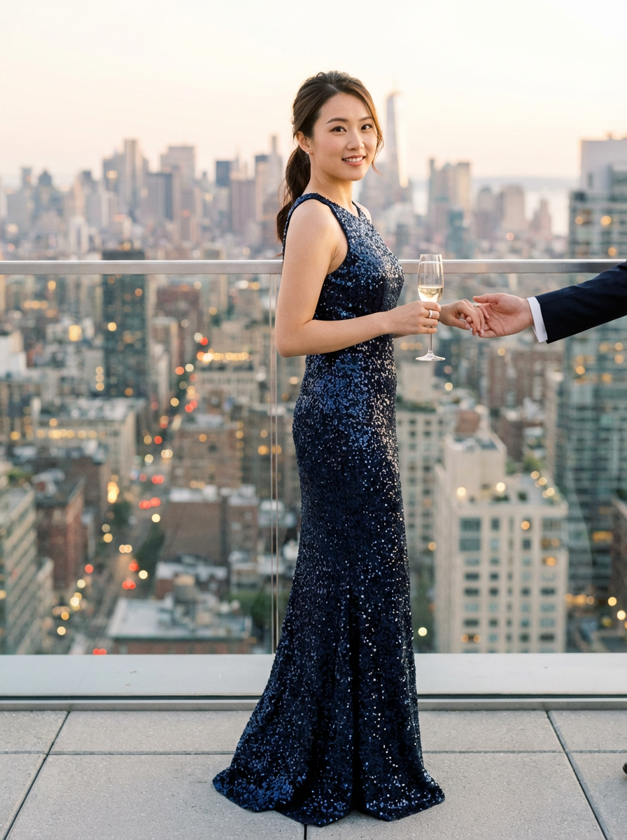 Luxury engagement photoshoot in a cityscape. Model wearing a classy evening gown . Standing on a rooftop with a skyline view, high-end engagement photography.