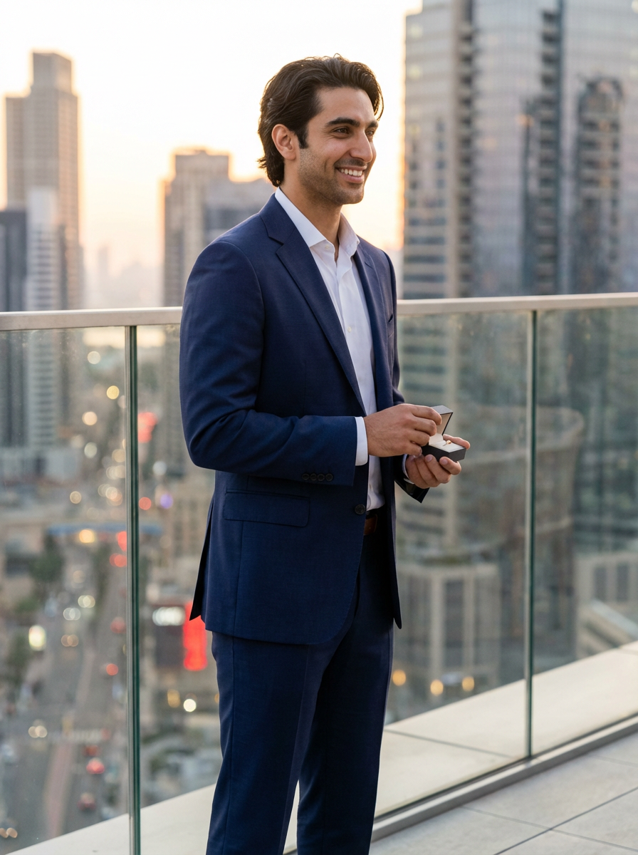Luxury engagement photoshoot in a cityscape. Model wearing a tailored suit . Standing on a rooftop with a skyline view, high-end engagement photography.